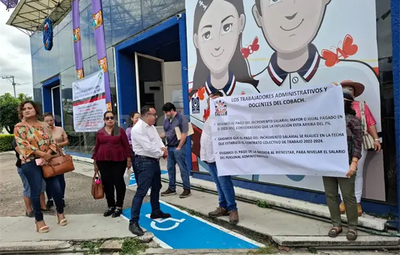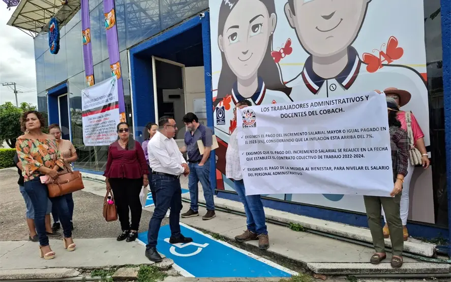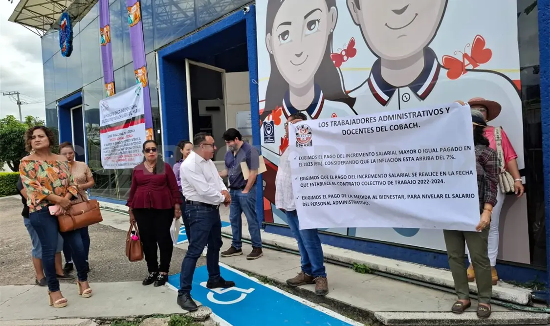 Trabajadores administrativos y docentes sindicalizados del Colegio de Bachilleres de Chiapas (Cobach) se sumaron al llamado a las autoridades federales para el solicitar el pago del incremento salarial mayor o igual al pagado en el 2023, que fue del seis por ciento, asimismo, el bono del bienestar que continúa pendiente.