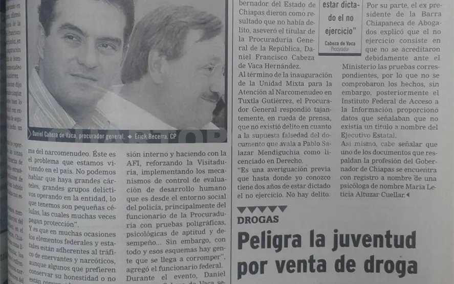 Al término de la inauguración de la Unidad Mixta para la Atención al Narcomenudeo en Tuxtla Gutiérrez, el procurador general respondió tajantemente, en rueda de prensa, que no existió delito en cuanto a la supuesta falsedad del documento que avala a Pablo Abner Salazar Mendiguchía como licenciado en Derecho.