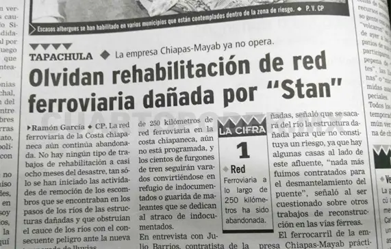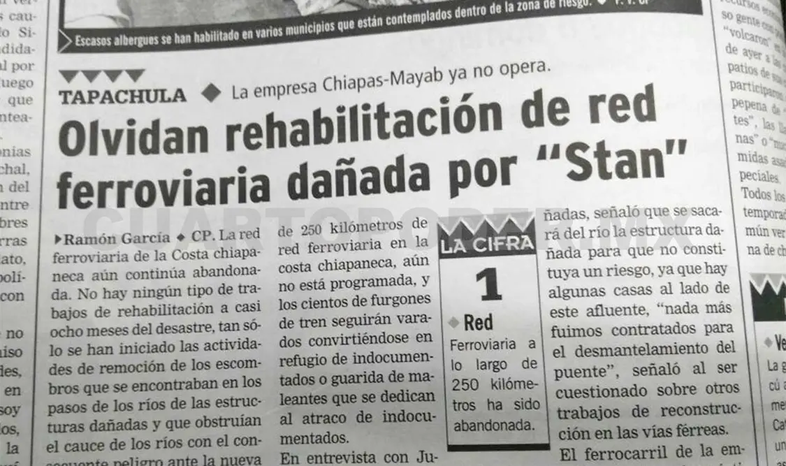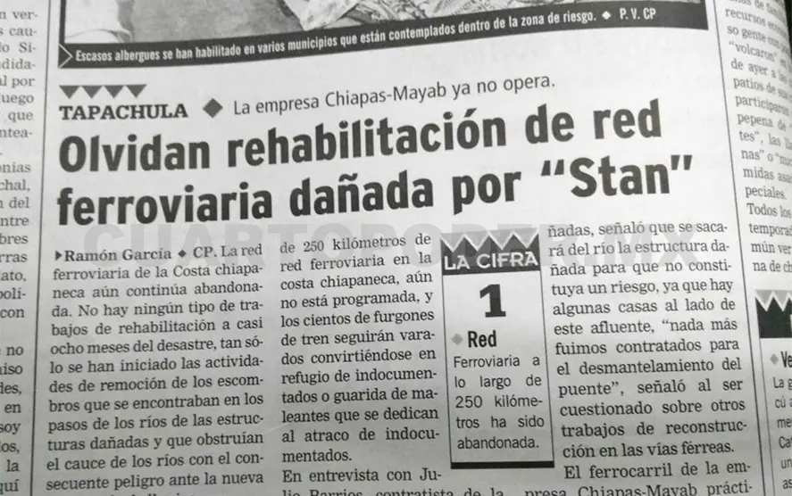 La reparación de los tramos dañados por el desastre a lo largo de 250 kilómetros de red ferroviaria en la costa chiapaneca, aún no esta programada, y los cientos de furgones de tren seguirán varados convirtiéndose en refugio de indocumentados o guarida de maleantes que se dedican al atraco de indocumentados.