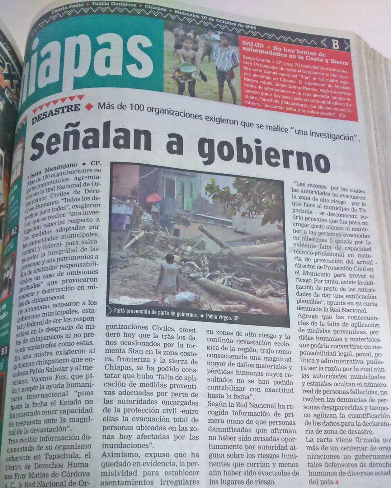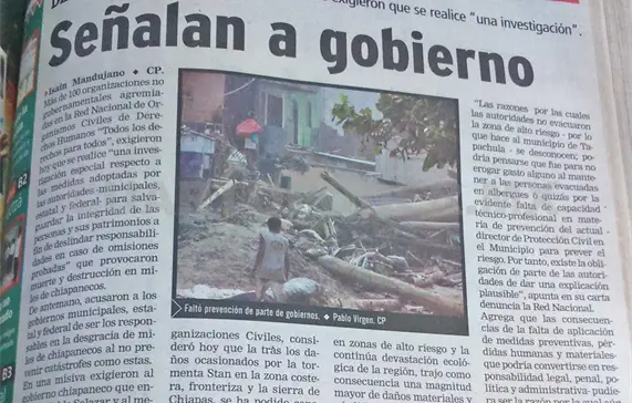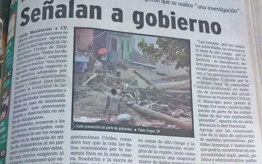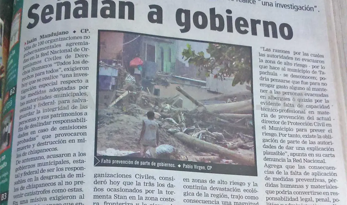 Tras recibir información documentada de su organismo adherente en Tapachula, el Centro de Derechos Humanos Fray Matías de Córdova A.C., la Red Nacional de Organizaciones Civiles consideró hoy que tras los daños ocasionados por la tormenta Stan en la zona costera, fronteriza y la Sierra de Chiapas, se ha podido constatar que hubo “falta de aplicación de medidas preventivas adecuadas por parte de las autoridades encargadas de la protección civil, entre ellas la evacuación total de personas ubicadas en las zonas hoy afectadas por las inundaciones”.