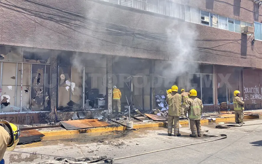 Los supuestos estudiantes quebraron cristales y material flamable como neumáticos y madera de tarimas, además de que lanzaron las denominadas bombas molotov al interior del lugar, luego de acudir a bordo de al menos dos camiones de pasajeros.