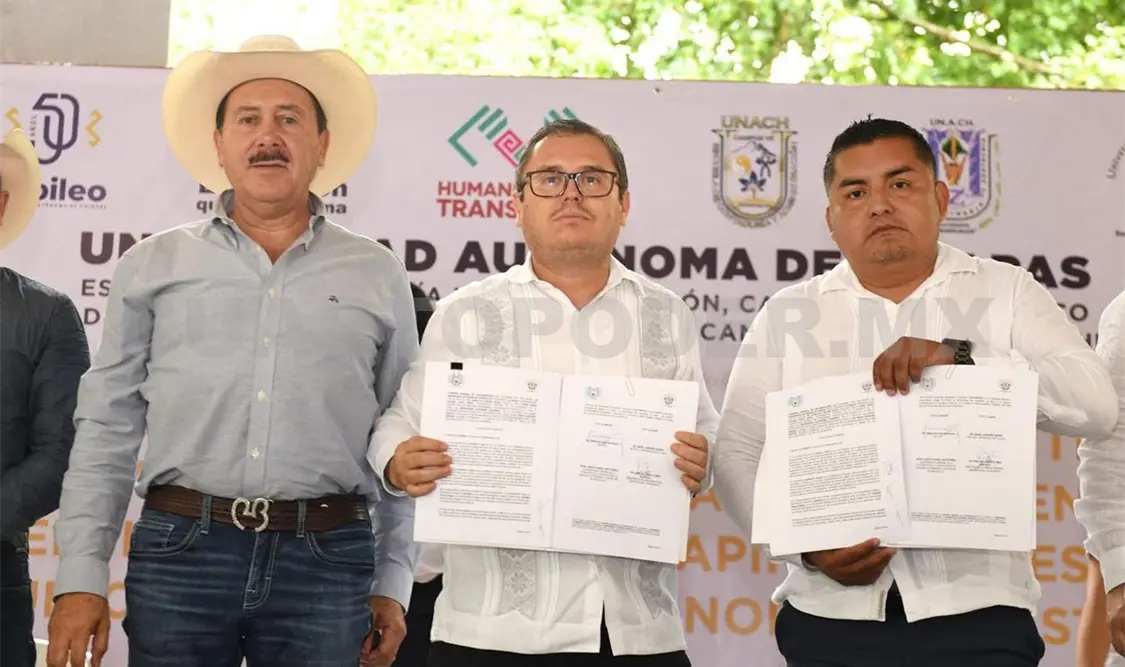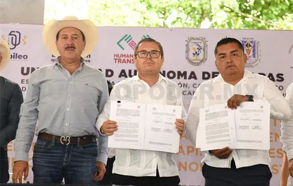Durante su gira de trabajo en el municipio de Pichucalco, el rector Oswaldo Chacón Rojas firmó un convenio general de colaboración con el director de la Unidad Regional Universitaria Sur Sureste de la Universidad Autónoma Chapingo, Eder de Jesús Flores Santiago y 11 ayuntamientos de la zona norte del estado.