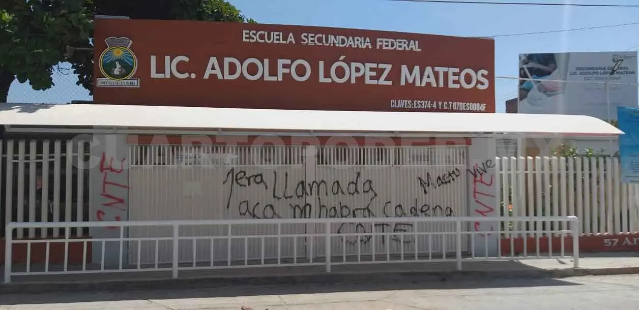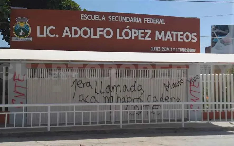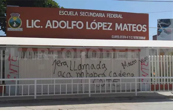 Un grupo de maestros de la Coordinadora Nacional de los Trabajadores de la Educación (CNTE) bloqueó los accesos y realizó pintas en la fachada de la Escuela Secundaria “Adolfo López Mateos”, por un par de horas, con el fin de impedir la realización de la cadena de cambios del nivel de secundarias generales.