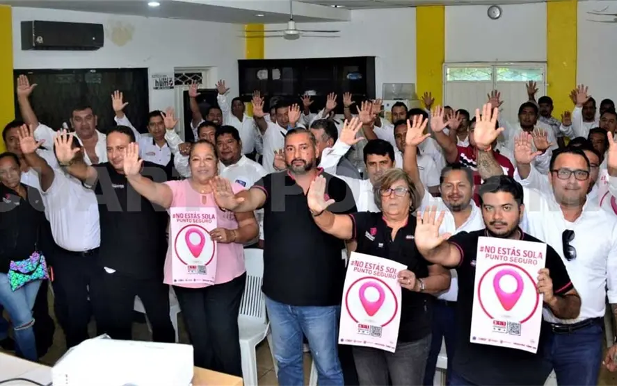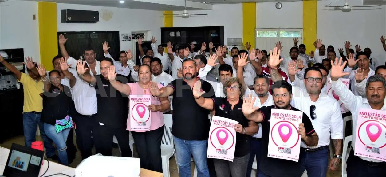 La Secretaría de Igualdad de Género Municipal y el Consejo Municipal de Seguridad Pública (Comsep) impartieron el taller de sensibilización a choferes del sitio de taxis Cristóbal Colón y realizaron un recorrido por el comercio establecido como parte del programa “Punto Seguro”, implementado por el Ayuntamiento de Tapachula.
