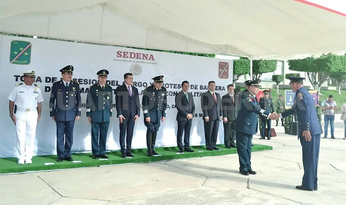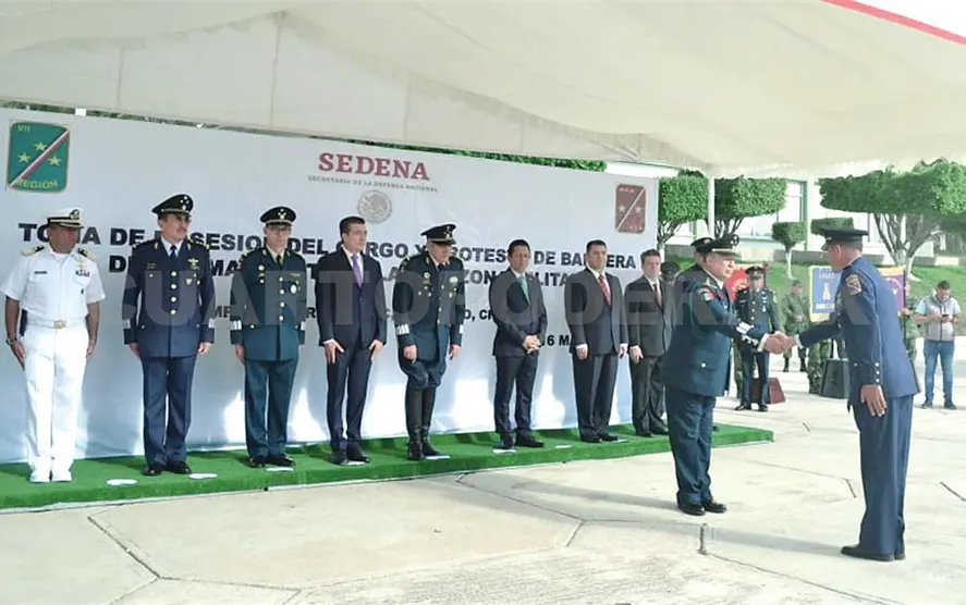En su intervención, el gobernador del estado dijo que la toma de protesta del mando militar en Chiapas tiene gran relevancia, un significado que compromete a todas las autoridades para estar a la defensa de la sociedad mexicana, del pueblo de México.