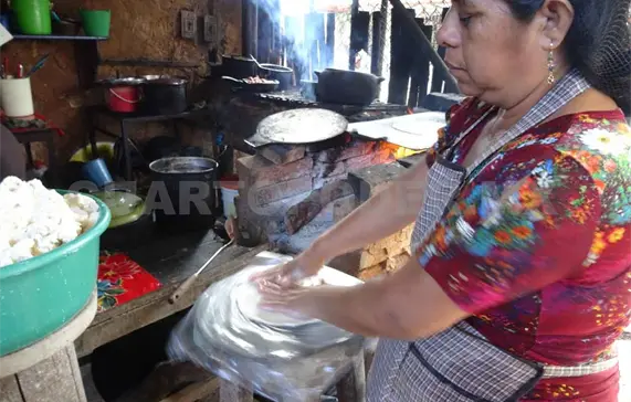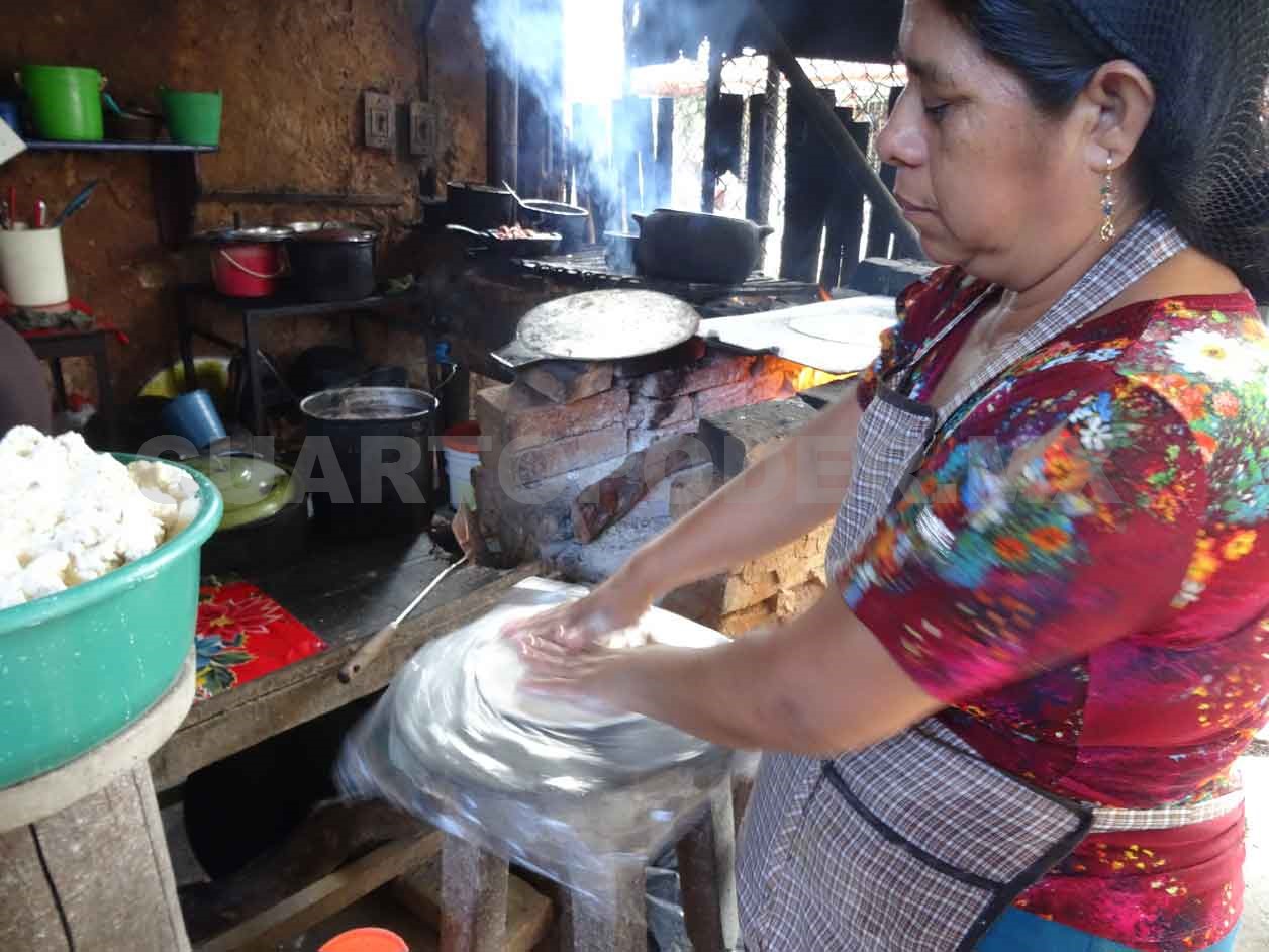 Doña Candelaria y Cristina toman con delicadeza la tortilla aún cruda y la postran sobre el comal, se expide un olor de maíz que se entrecruza con el de la leña y los guisos de las ollas. Las tortillas se inflan, al parecer esta es la indicación para darle la vuelta o sacarla del comal y entregarla al comensal.