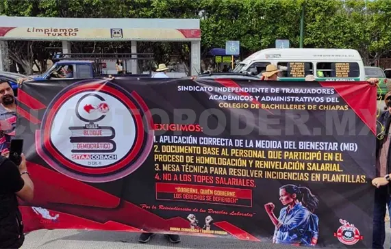Trabajadores del Colegio de Bachilleres de Chiapas (Cobach) agremiados al Sindicato Independiente de Trabajadores Académicos y Administrativos del Cobach (SITAACobach) se manifestaron ayer por la mañana a las afueras de las oficinas de la Dirección General de esa institución educativa.