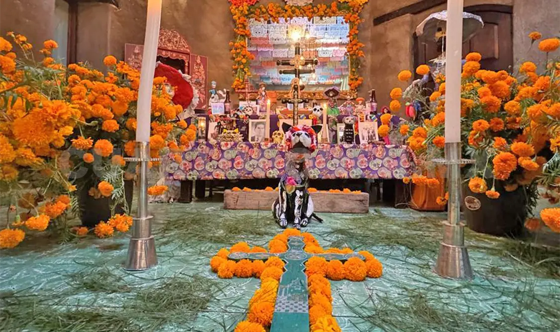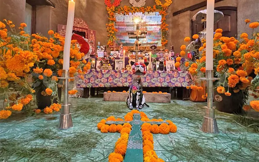 El camino hacia el altar está adornado, relata Bonifaz León, con flores de seda y cempasúchil, con cirios que alumbran el camino de las almas. En medio del trayecto, una cruz con la flor de color naranja complementan el escenario.