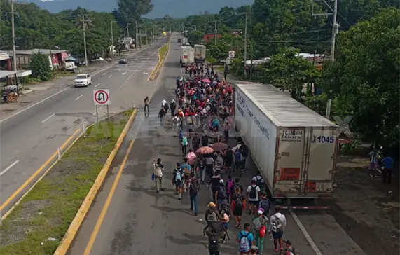 A pesar del riesgo que representa, cientos de migrantes caminan sobre la carretera Costera en su intento de dejar Chiapas en su viaje hacia los Estados Unidos, sin aceptar que el Instituto Nacional de Migración (INM) los traslade a Tuxtla Gutiérrez, en donde les ofrecen iniciar su proceso de regularización.