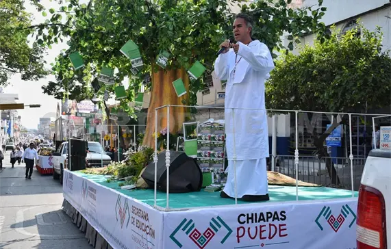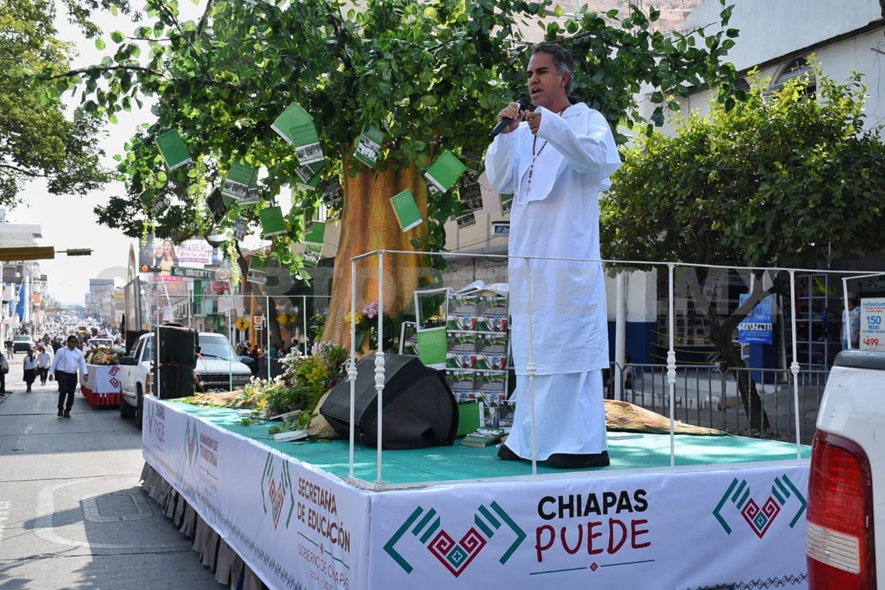 El contingente educativo destacó por la presencia de carros temáticos que reflejan la visión transformadora del sistema educativo chiapaneco. Uno rindió homenaje a Fray Matías de Córdova, cuya metodología inspira el Programa de Alfabetización Chiapas Puede; otro representó el Árbol de la Pedagogía de las Consciencias, símbolo del nuevo modelo formativo; y un tercero conmemoró los 100 años de la Escuela Primaria Camilo Pintado Rincón, institución emblemática en la historia educativa del estado.