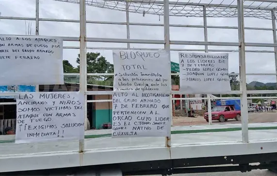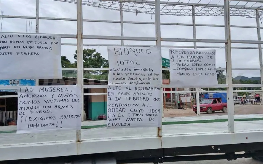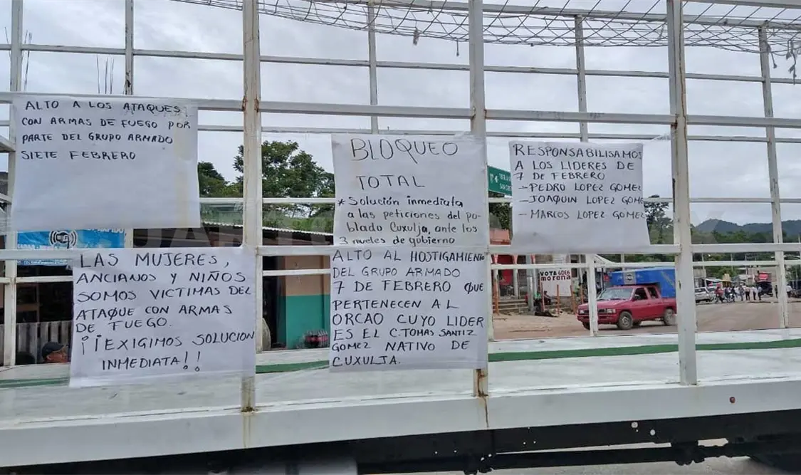 Posteriormente colocaron cartulinas en el vehículo con las leyendas: “Alto a los ataques con armas de fuego por parte del grupo armado 7 de Febrero”, “Las mujeres, ancianos y niños somos víctimas del ataque con armas de fuego”, “Exigimos solución inmediata a las peticiones del poblado Cuxulja”, entre otras.