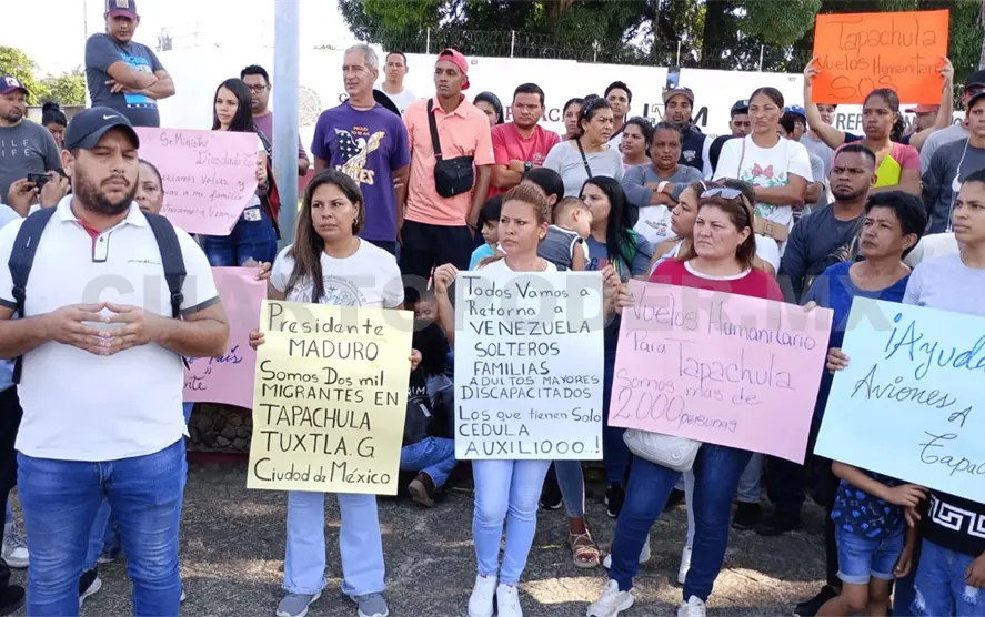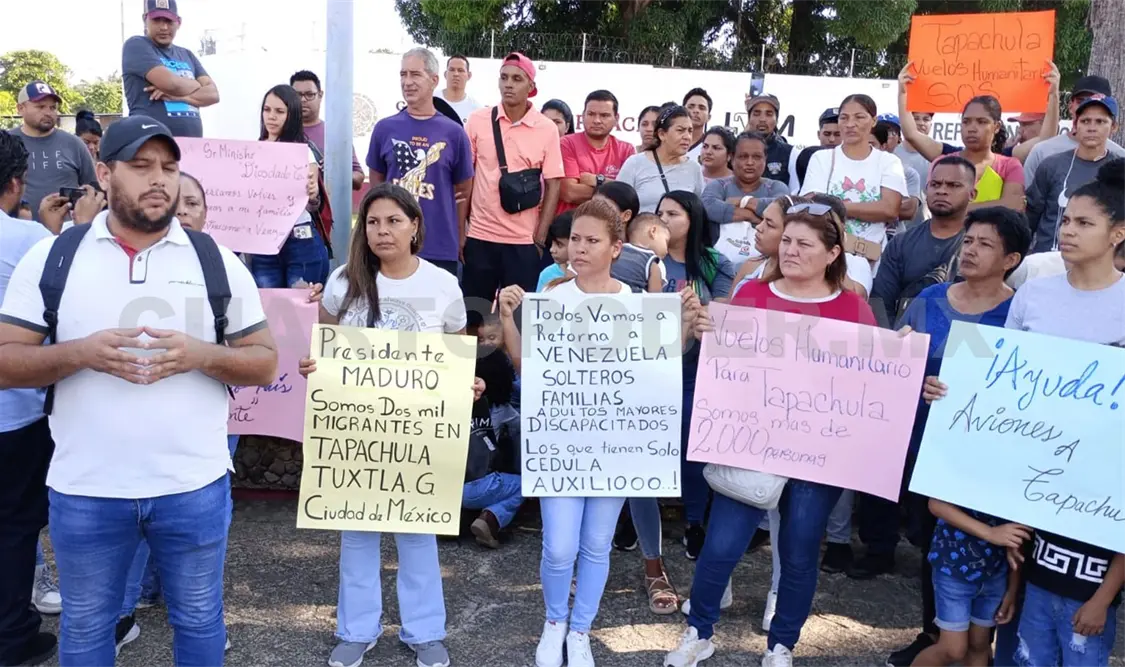 En una manifestación en la Estación Migratoria Siglo XXI, con pancartas en mano pidieron al presidente Nicolás Maduro que envíe aviones a Tapachula para que los lleve de regreso a su patria.