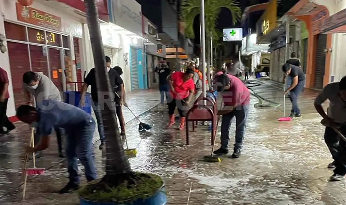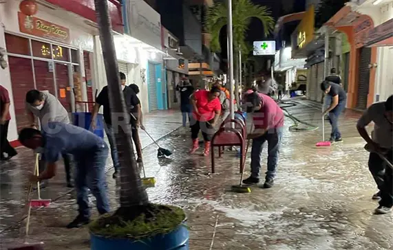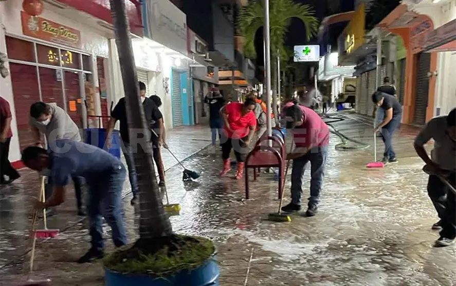 Personal de las secretarías de Servicios Públicos, de Desarrollo Urbano y Ecología y de Protección Civil junto con dueños de establecimientos, participaron en las actividades de saneamiento en el sendero peatonal.