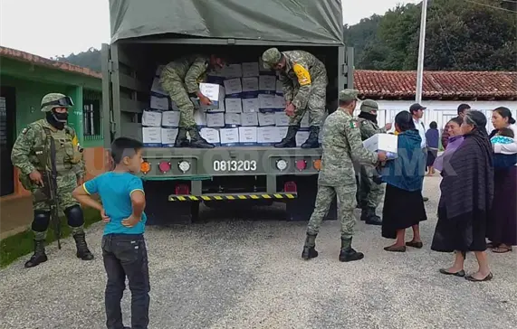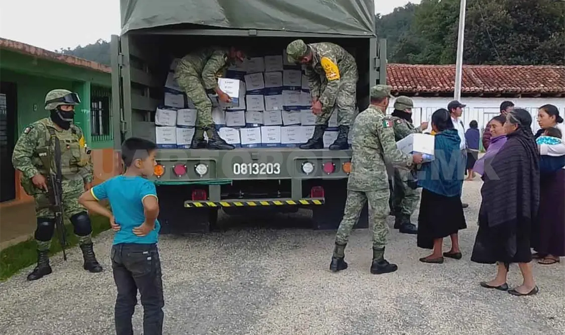 Elementos militares llegaron a las comunidades de Rancho Nuevo y El Aguaje en San Cristóbal, donde distribuyeron 700 despensas, con el objetivo de auxiliar a la población que sufrió daños durante las fuertes lluvias que se presentaron en fechas pasadas en el sureste del país.