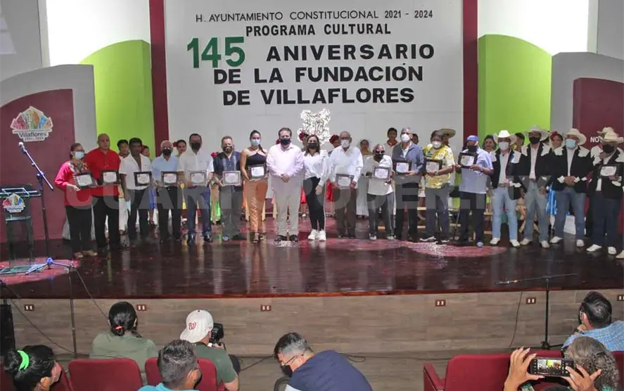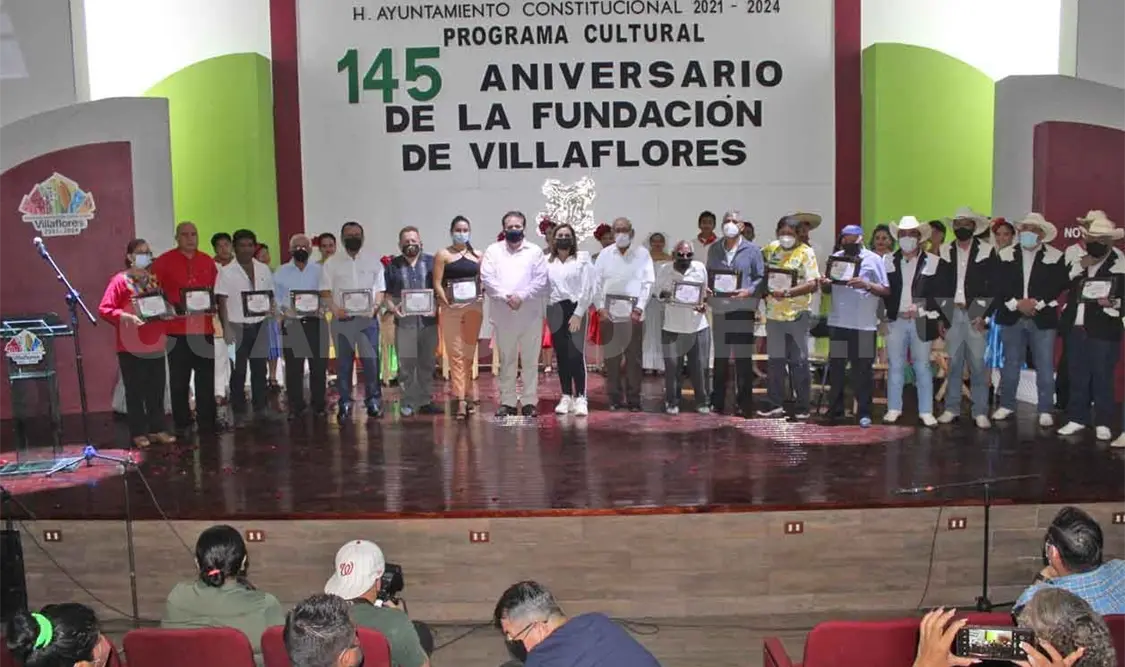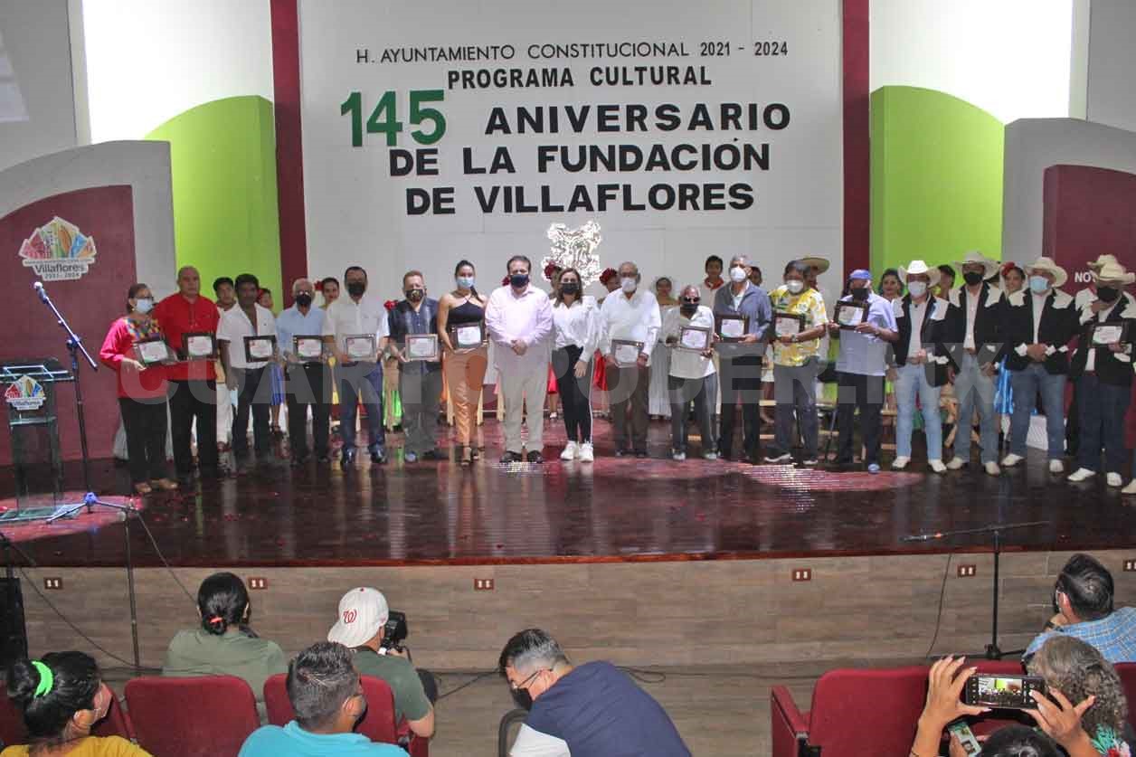 El alcalde Mariano Rosales Zuarth y su esposa Margarita Sarmiento Tovilla entregaron reconocimientos a ciudadanos vivos destacados en los ámbitos educativo, cultural, deportivo y social del municipio, entre ellos don Rodolfo Ovando Espinoza, último miembro del extinto Club de Leones de Villaflores. En el ámbito musical se entregaron reconocimientos a Ezequiel Sol Estrada y su Grupo Musical Los Madrugadores; Alberto López Sol, constructor de marimbas; Israel Gómez, por su trayectoria musical en marimba y Julián Hernández Hernández, constructor de marimba y maestro de música en la Casa de la Cultura José Emilio Grajales.