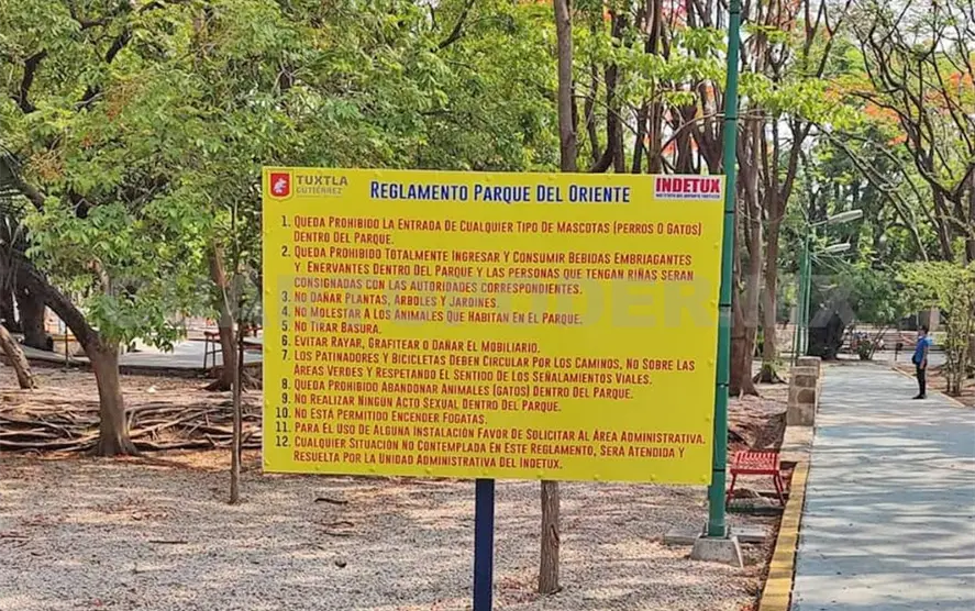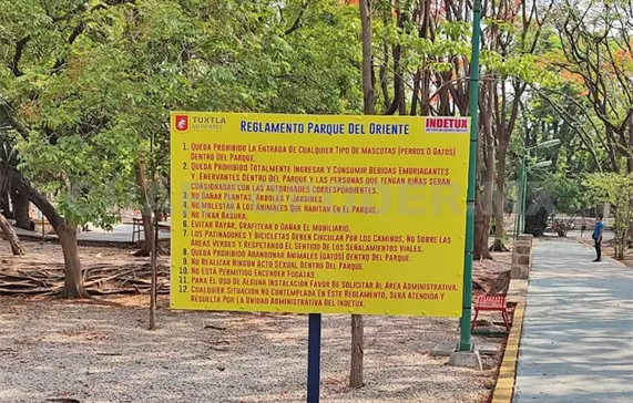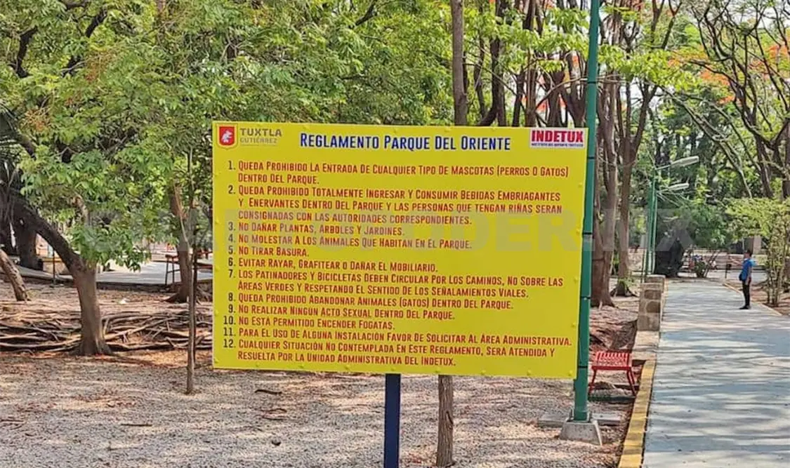 De manera oficial se dio a conocer el nuevo reglamento del parque del Oriente. Luego de varias asambleas, las autoridades del Instituto del Deporte Tuxtleco (Indetux) llegaron a un acuerdo para que sean 12 los decretos que se tendrán que respetar en las instalaciones. Especificaron que cualquier situación que no esté contemplada será resulta por la unidad administrativa.