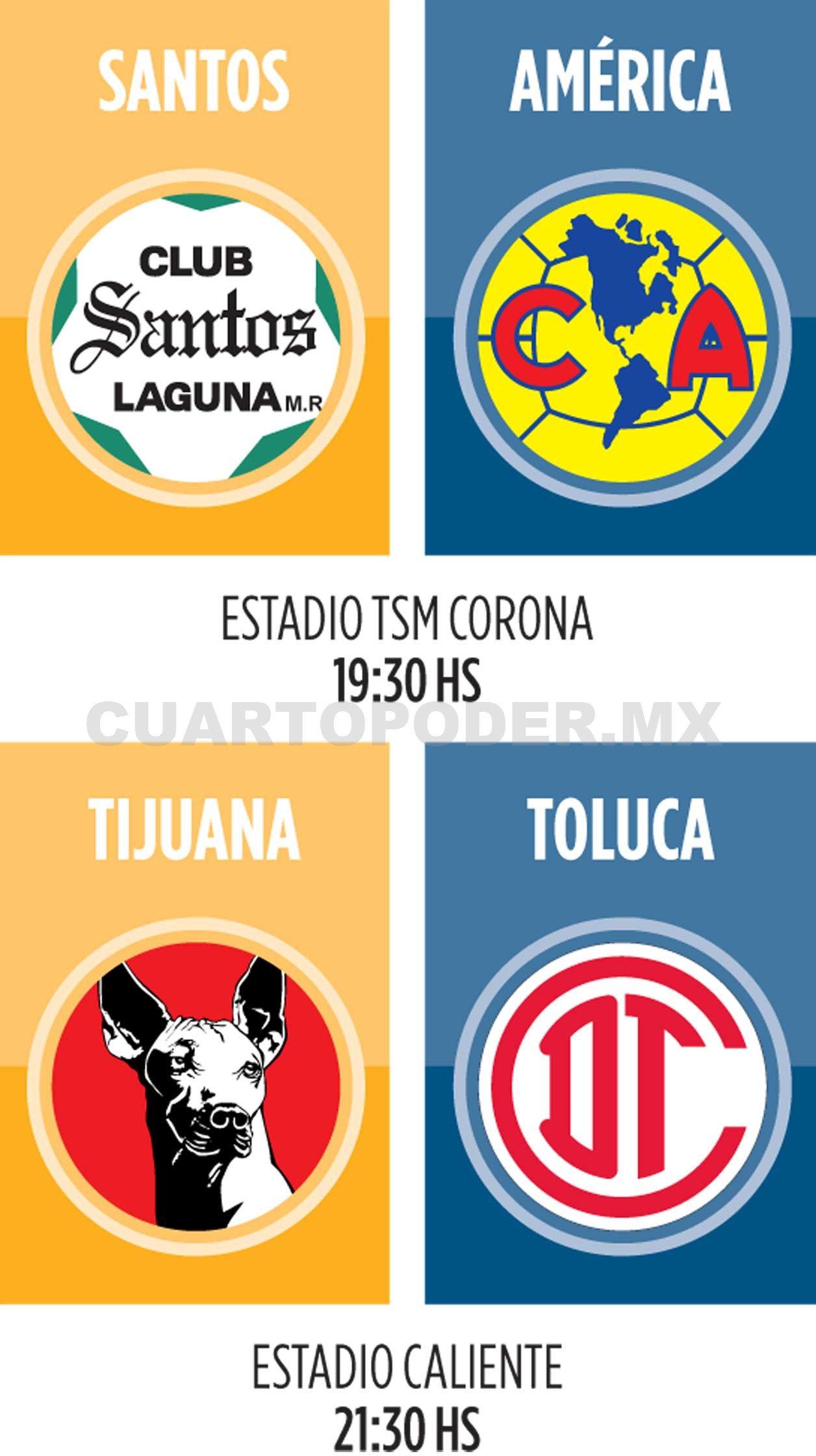 La Liga MX anunció cambios en los horarios de los partidos de ida de semifinales, que disputará Toluca ante Xolos, así como América con Santos Laguna. Las hostilidades darán inicio en la cancha del estadio Corona, donde el cuadro de la Comarca Lagunera hará los honores a las Águilas a partir de las 19:30 horas y no a las 20:00, como se había informado.