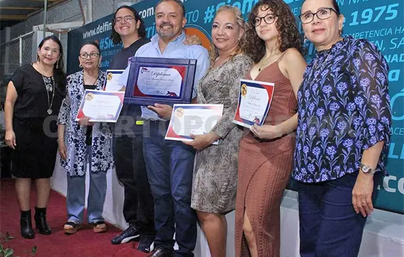 El acto continuó con la entrega de placas, y en esta ocasión se implementó un reconocimiento especial para quienes mediante su labor han ayudado a difundir los logros de El Delfín, tocando este año el turno a Víctor Manuel García Gómez, comunicador con 43 años de trayectoria en la crónica deportiva.