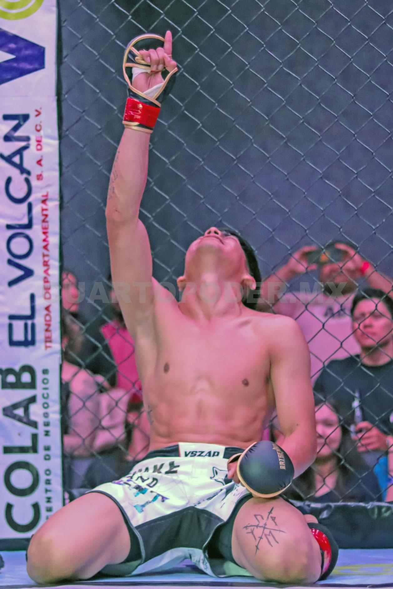 La emoción continuó con la tercera pelea de la noche, entre el chiapaneco Juan Pérez y el jarocho Félix Sibaja. El de casa ganó el combate aplicando una barra de brazo, para llevarse el aplauso de la gente.