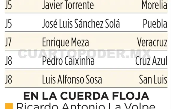 En la jornada cinco y después de perder con América, Javier Torrente quedó fuera de Monarcas Morelia y fue sustituido por Pablo Guede; en esa misma fecha José Luis Sánchez Solá dirigió por última vez a Puebla que cayó 4-0 con Pachuca. Después de un interinato de Octavio Becerril, Juan Reynoso asumió el control de los camoteros.
