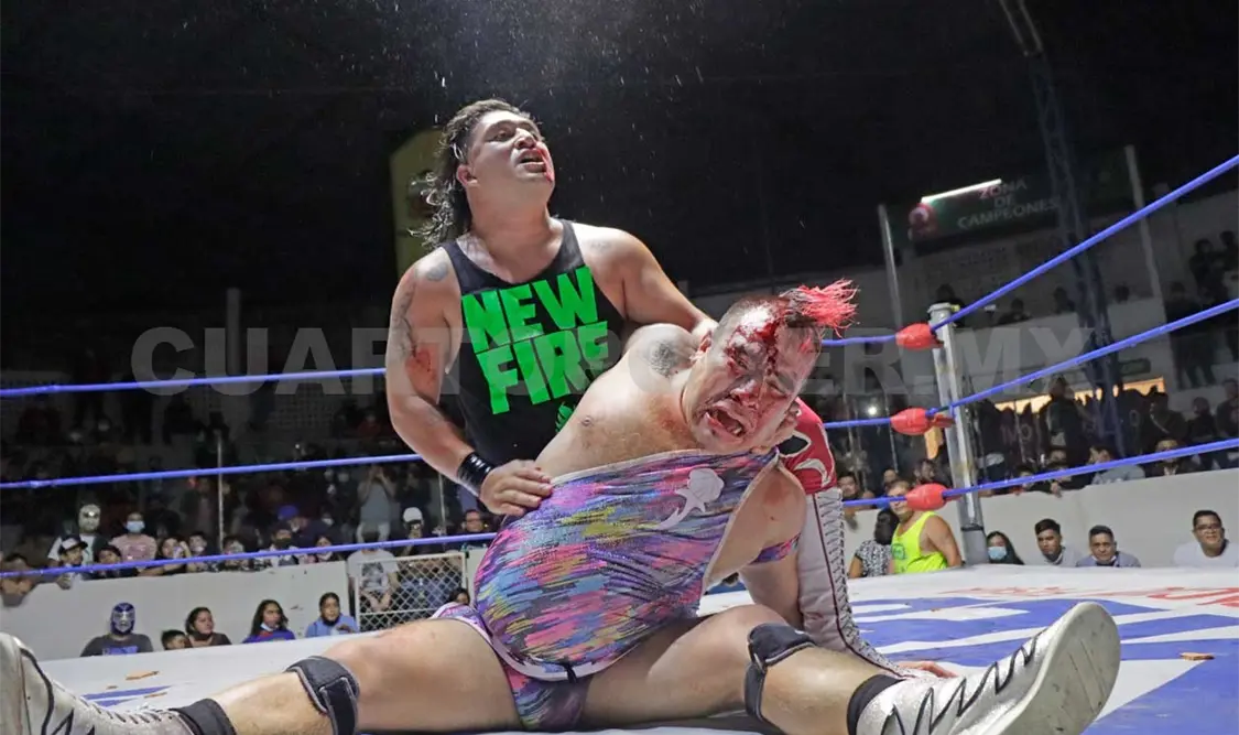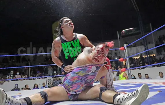 Bastaron instantes para que la reyerta entre ambos gladiadores subiera de tono e hiciera que ambos se lastimaran la parte de la sien. New Fire fue el primero en saborear la sangre, pues a mordidas hirió a su rival; este se la cobró en cuanto pudo, por lo que en un abrir y cerrar de ojos, los dos luchadores veían correr el plasma sobre su rostro.