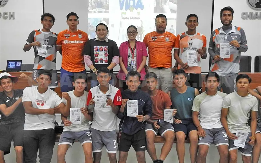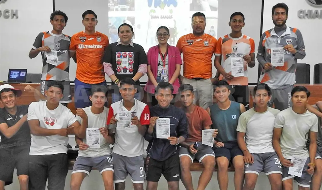 El director deportivo del club, Víctor Hugo León Ramírez, y la plantilla escucharon atentamente la presentación llevada a cabo por Karina Rivera y José Luis Molina, en el auditorio de Medicina de la Universidad Pablo Guardado Chávez, donde les hicieron saber que a diario se requieren unidades de sangre para niños y jóvenes que están en tratamiento.