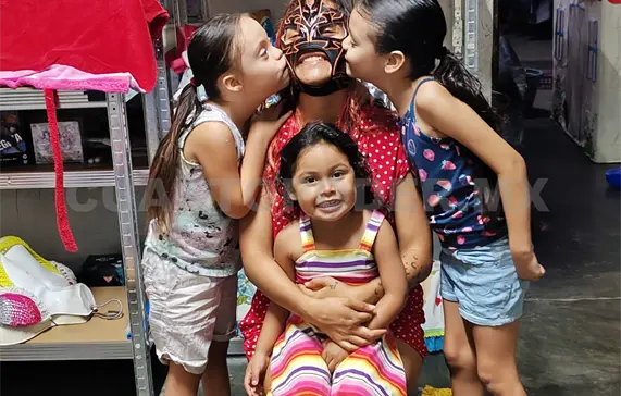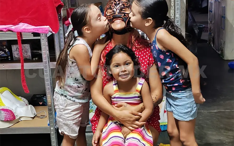 La mamá enmascarada comparte con “Cuarto Poder” la dulzura y paciencia que procura hacia sus niñas —de 3, 6 y 7 años—, con quienes convive alegremente aprovechando que tiene un negocio en casa, el cual atiende entre semana, algo que contrasta con la rudeza con la que enfrenta a sus oponentes en las carteleras del Deportivo Roma.