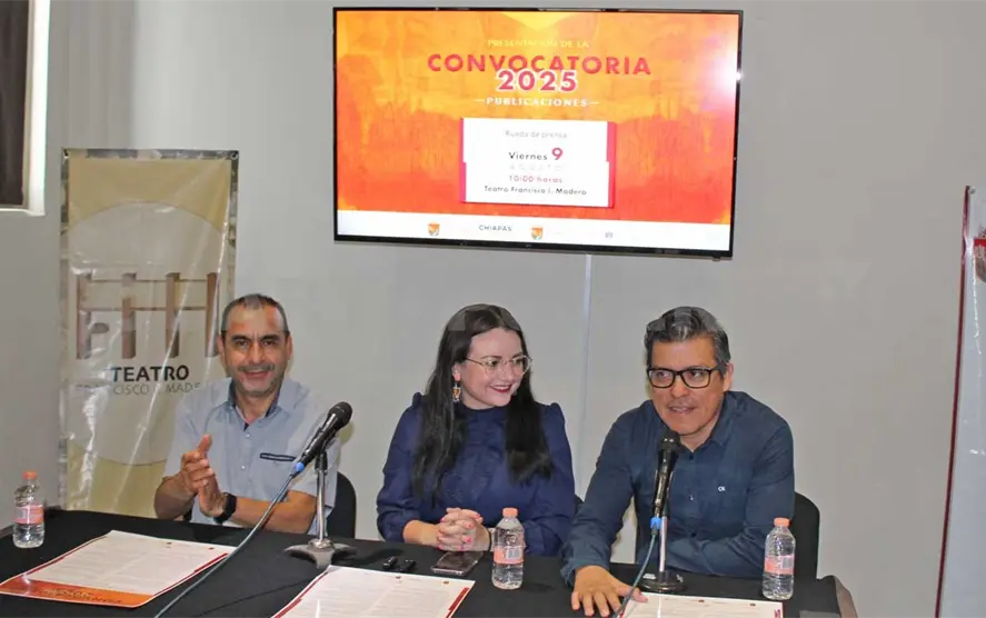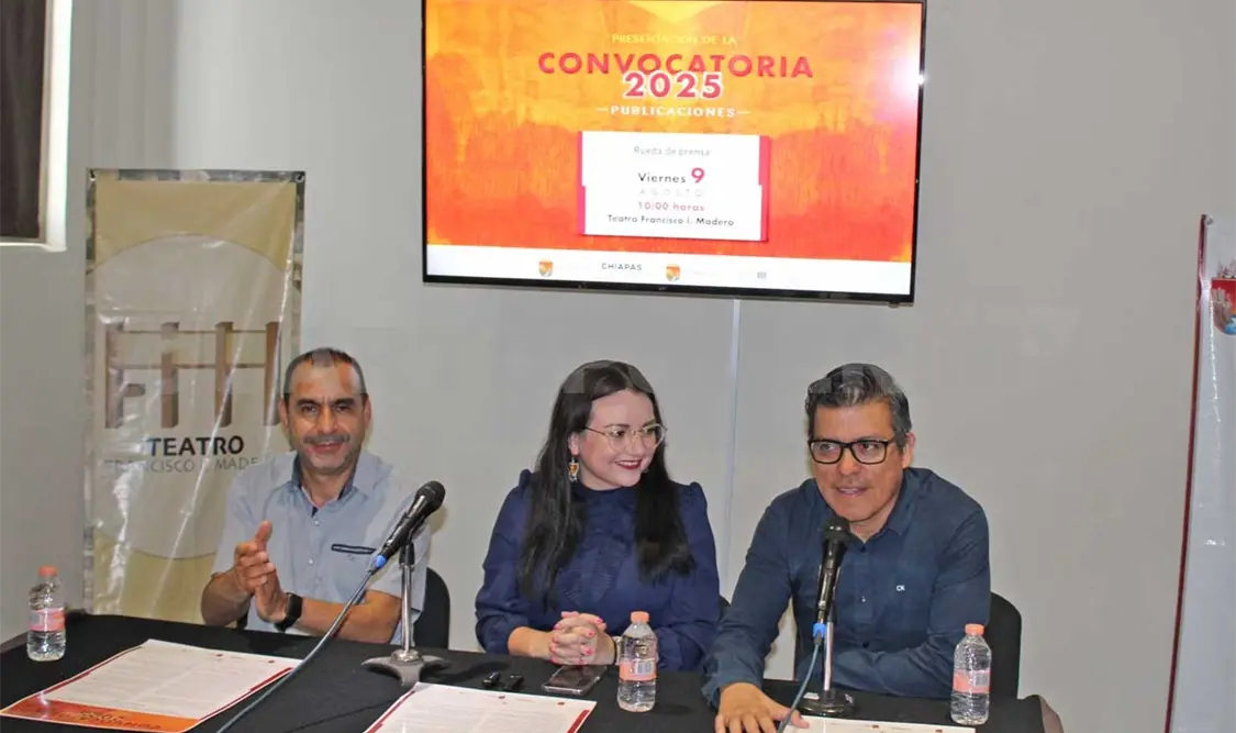 En conferencia de prensa, autoridades del Consejo Estatal para las Culturas y las Artes de Chiapas (Coneculta), César Trujillo, director de Publicaciones; Maritza Maranto, directora general, y Manuel Gutiérrez, coordinador operativo técnico, dieron los pormenores de la Convocatoria de Publicaciones 2025, dirigida a escritores de Chiapas o radicados en el estado, con cinco o más años de residencia.