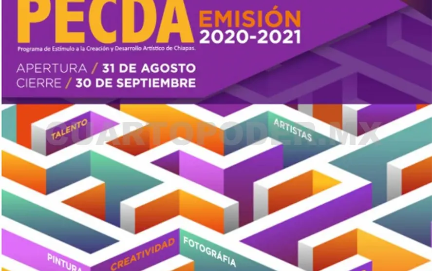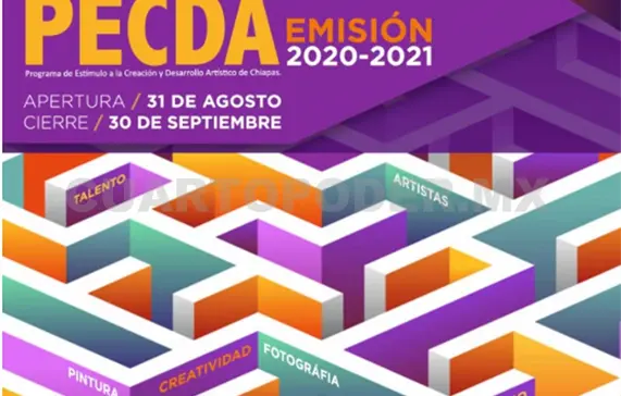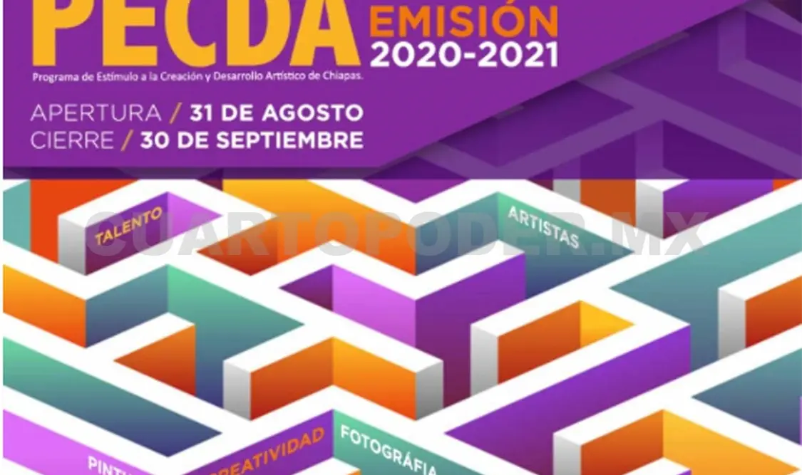 La Secretaría de Cultura Federal, en conjunto con el Consejo Estatal para las Culturas y las Artes de Chiapas (Coneculta), lanzó la convocatoria del Programa de Estímulo a la Creación y Desarrollo Artístico (Pecda, emisión 2020-2021), la cual permanece abierta desde el 31 de agosto y cerrará el 30 de septiembre del año en curso.