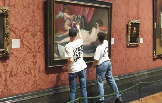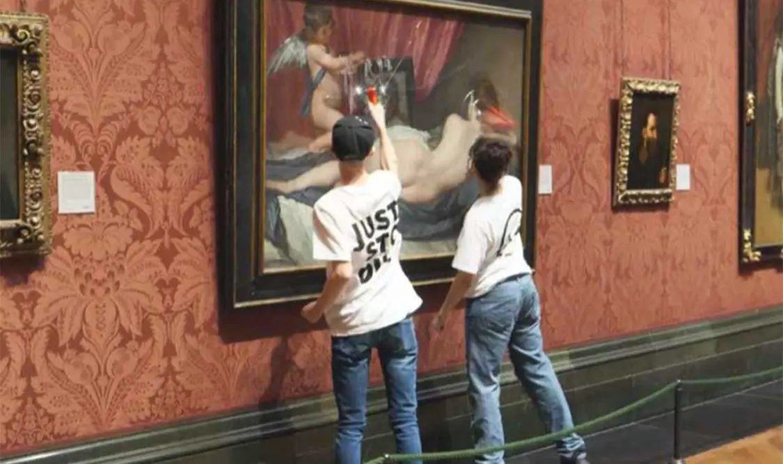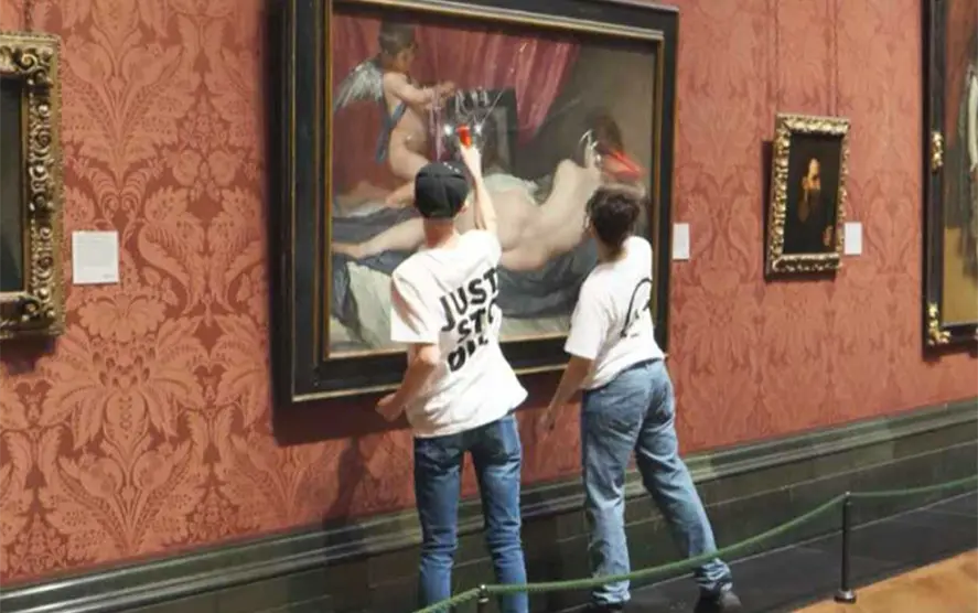 El video del ataque fue publicado por la cuenta oficial de Just Sopt Oil, una grupo de activismo en pro de acabar con el uso del petróleo, después de que dos de sus integrantes se dieran cinta en las instalaciones de la galería londinense con un par de martillos de emergencia, para golpear el vidrio que protege una de las obras más representativas de Velázquez: El Venus del espejo (1599-1660), la que recibió varios impactos antes de que los jóvenes soltaran sus herramientas y dieran a conocer su consigna.