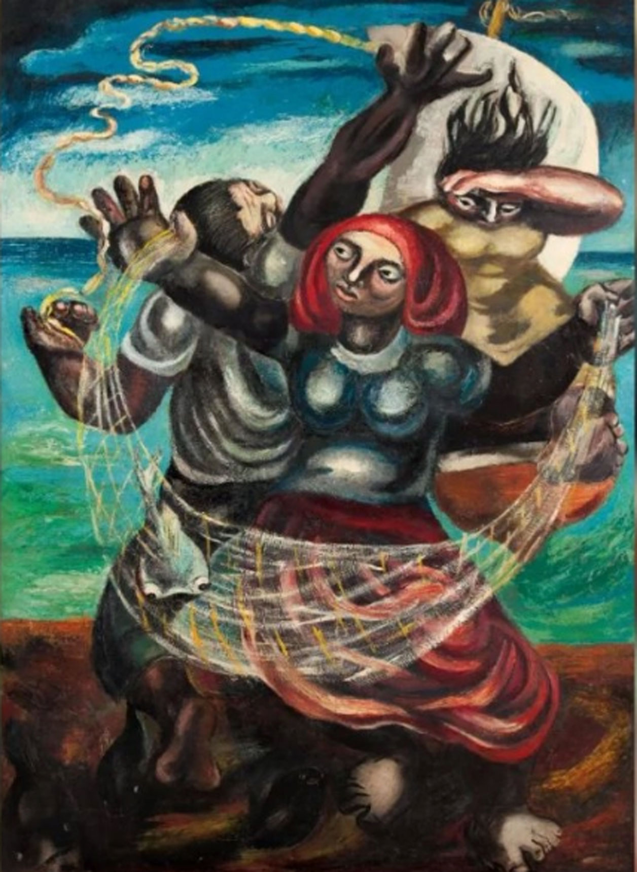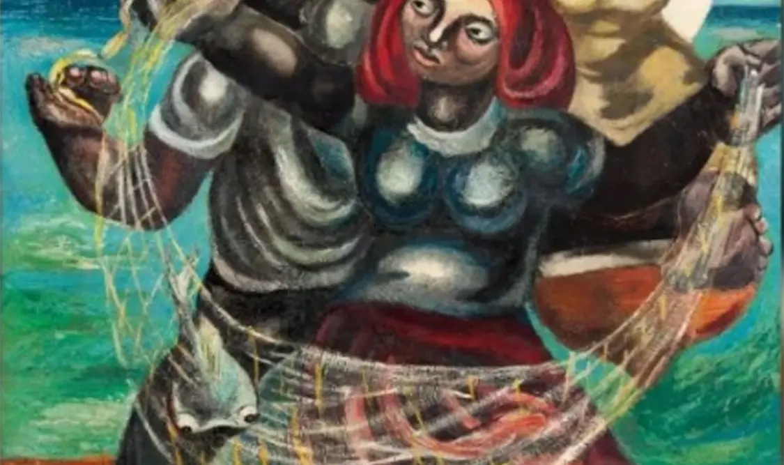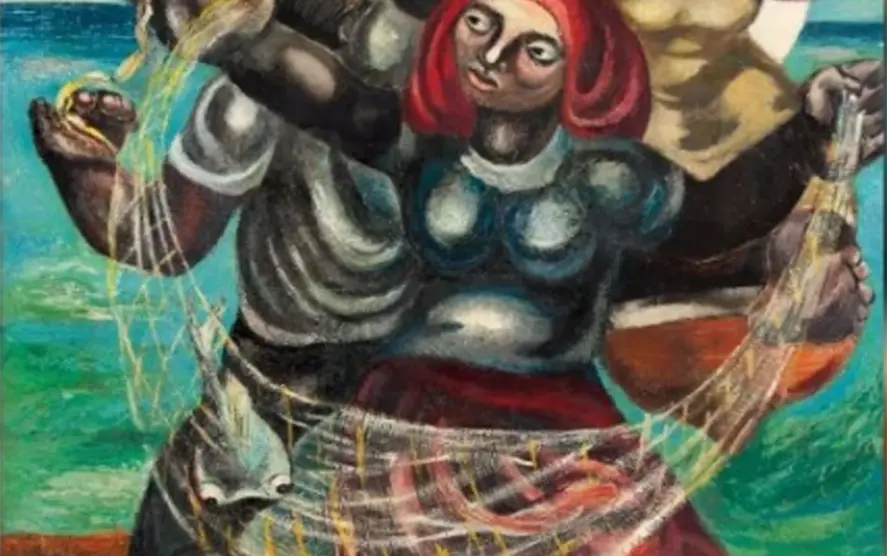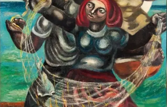 Se trata de una obra “imponente”, no solo por su tamaño —mide 166.5 por 122 centímetros—, sino por su colorido brillante, fuerte, a la vez que está ejecutada sobre masonite, con duco o piroxilina, pintura industrial que se usa para coches. Es una obra costumbrista, no de tema político, en la que en un primer plano una mujer se encuentra de pie pendiente de sus pescados recién atrapados. Detrás de ella, otra mujer salta de la pequeña barca, mientras una figura masculina trata de agarrar un cordón y amarrarlo al mástil.