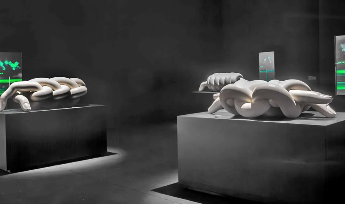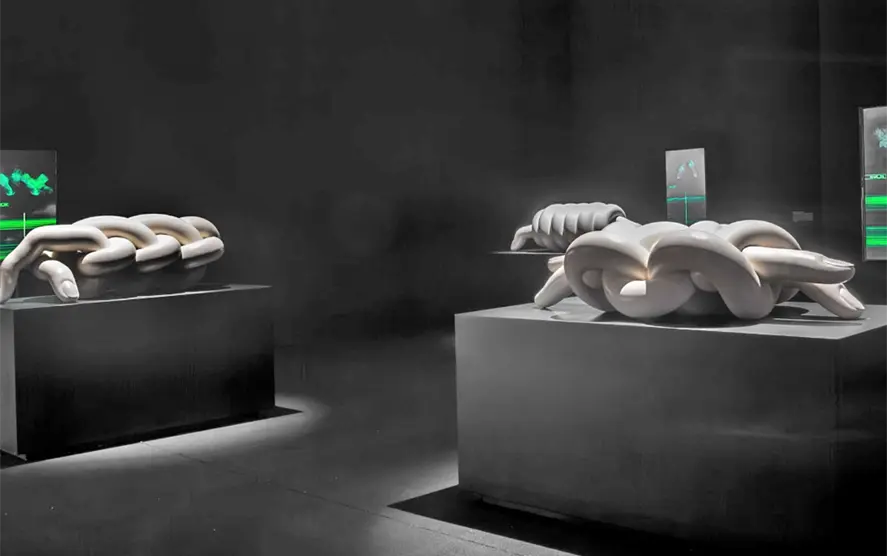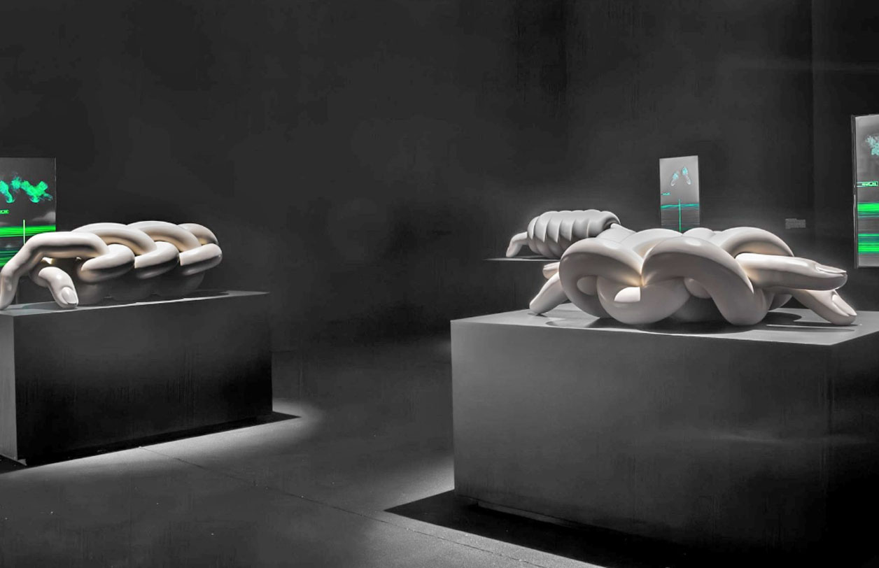 Finalmente, Muñoz rinde un homenaje a las manos con Dedo macramé, al verlas “como un dispositivo tecnológico”, dice. Para hacer estas obras, Muñoz tejió con guantes inteligentes información de un software para así también crear un elemento musical que acompaña la obra. “Cuando caminas alrededor de cada escultura, emite sonidos y mutan cuando cambias de lugar”, describe.