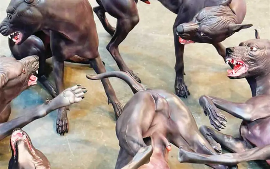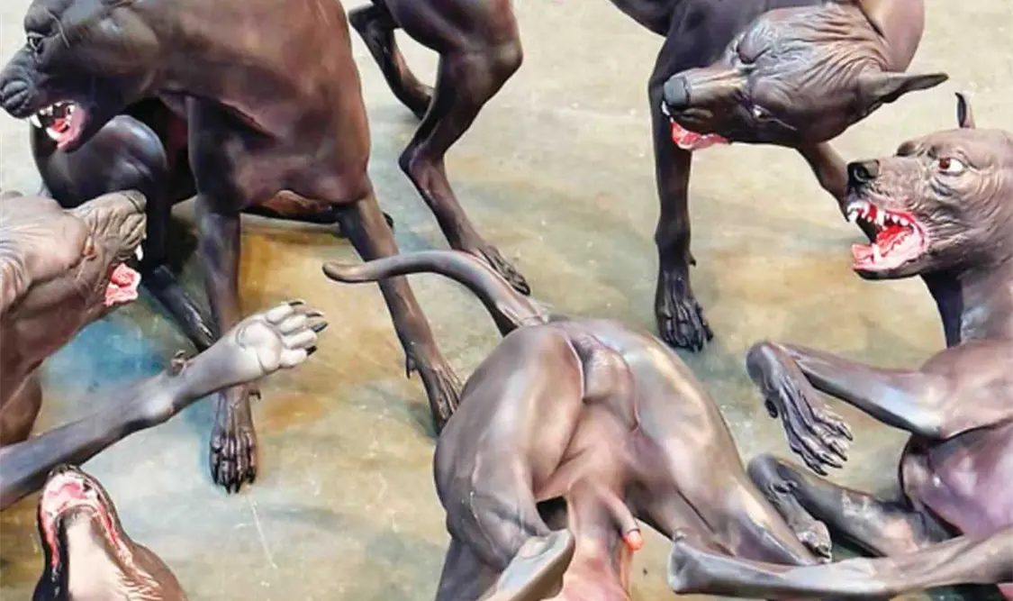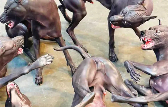 Seis xoloitzcuintles, la raza de perro sin pelo originaria de México, se pelean a muerte; rabiosos, los ojos enrojecidos, llenos de ira, los colmillos amenazantes; uno se retuerce de dolor.