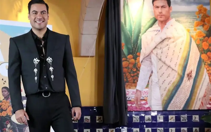 En la pintura se puede ver al exacadémico portando un zarape blanco que, según contó, fue hecho por una familia de artesanos de Huamantla, su pueblo natal, además de estar adornado con flores de cempasúchil y las características alfombras de Día de Muertos.