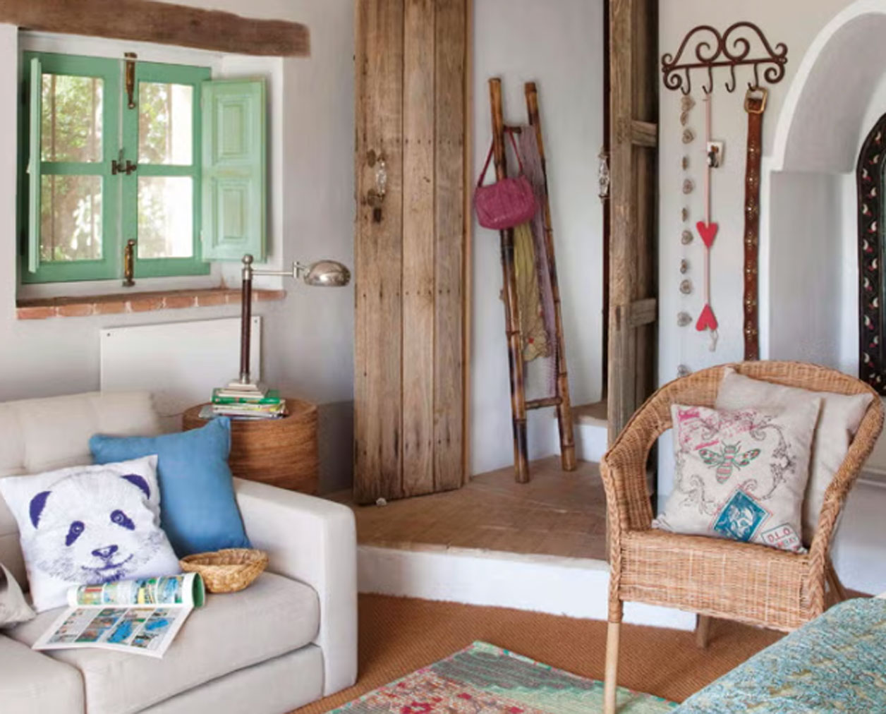 Recupera elementos relacionados con la vida en el campo: aperos de labranza, sombreros, botijos, platos de cerámica... y conviértelos en objetos decorativos. Crearás un ambiente especial. En este rincón, la pared se pone a la sombra bajo el ala de varios sombreros de paja. ¿Tienes una plancha de hierro? ¿Un candil? Quedarán perfectos en un rincón en el suelo o sobre una mesa con otros complementos deco más actuales. ¡Mezcla!