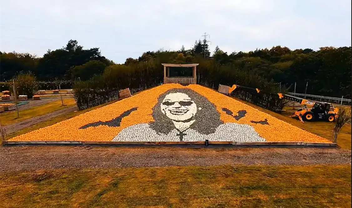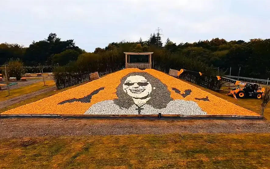 Se utilizaron 10 mil calabazas y calabacines, muchas de las cuales fueron pintadas de blanco o negro para mostrar a Ozzy sonriente, con sus emblemáticos lentes redondos, crucifijo y 3 murciélagos volando a un costado.