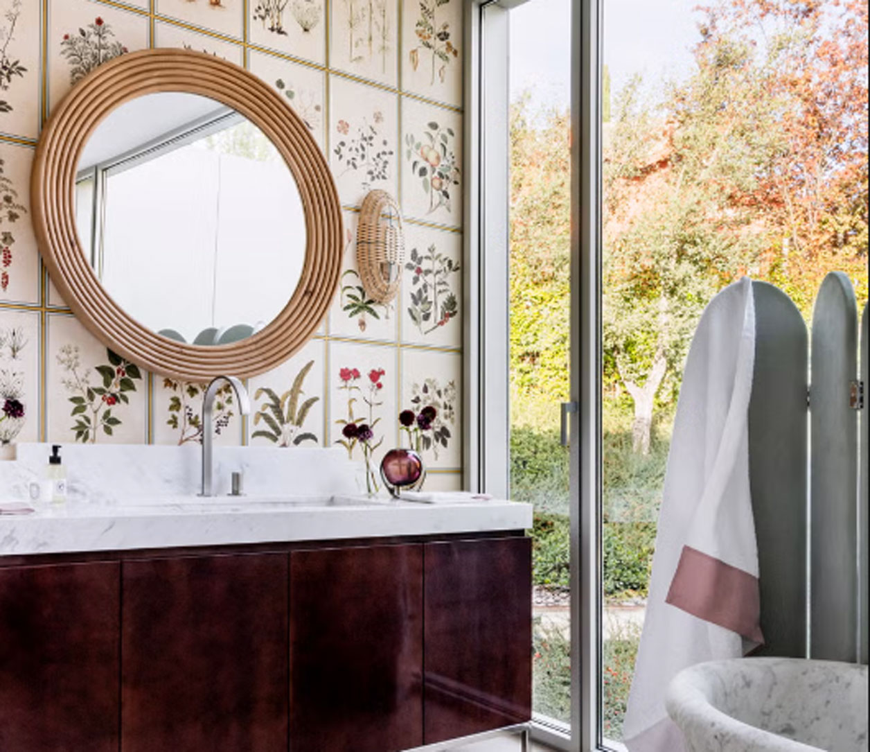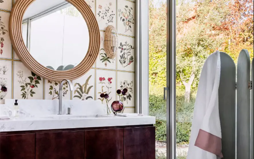 En el baño principal de esta impresionante casa a las afueras de Madrid diseñada por Luis García Fraile, las paredes se han cubierto con el papel pintado con motivos botánicos Renaissance Herbier, de Iksel, en Pablo Torre. El mueble de madera es de tulipie burdeos y dolomita, de LGF Spaces; el espejo redondo se compró en Berenis y los apliques son franceses.