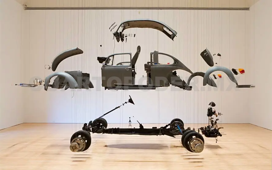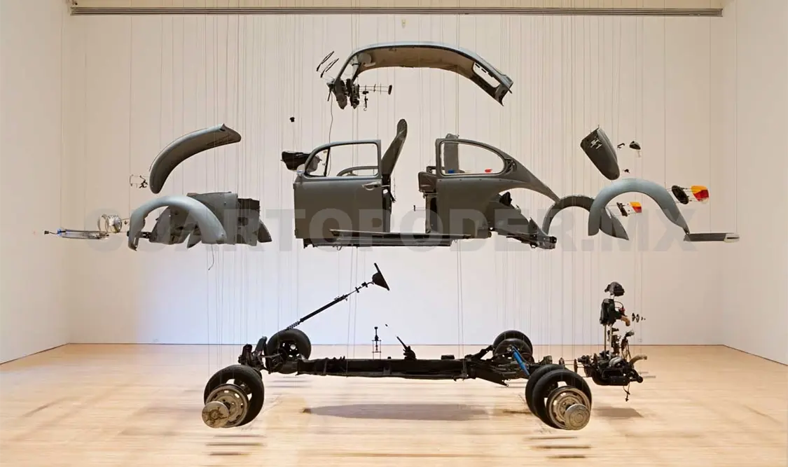 La pieza —un auto Volkswagen modelo 1989 desarmado y suspendido del techo por cables— fue producida originalmente en el Instituto de Arte Contemporáneo de Filadelfia en 2002, y luego en 2003 se llevó a la 50ª Bienal de Venecia, enmarcada en la exhibición “Lo cotidiano alterado”, curada por Gabriel Orozco. Ahora la instalación celebra su “larga vida” en el Museo Guggenheim de Bilbao, en la muestra colectiva “El arte y el espacio”.