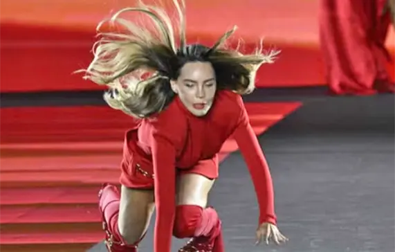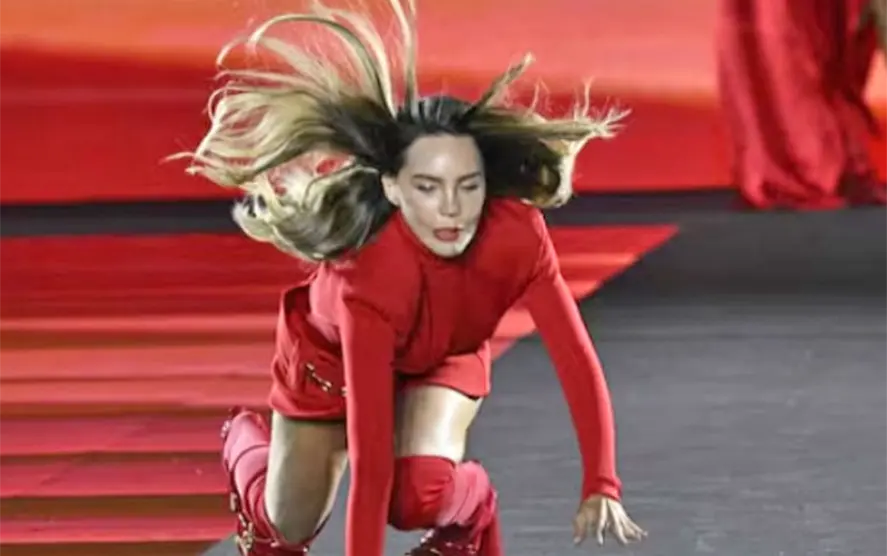 Belinda, vestida con un llamativo minivestido rojo, botas altas y un cinturón dorado, perdió el equilibrio en medio de la pasarela. Aunque el momento fue inesperado, la cantante reaccionó con profesionalismo, se levantó rápidamente y continuó desfilando, lanzando un beso al público que celebró su valentía.