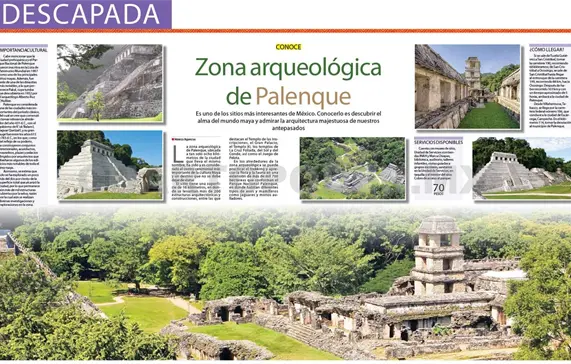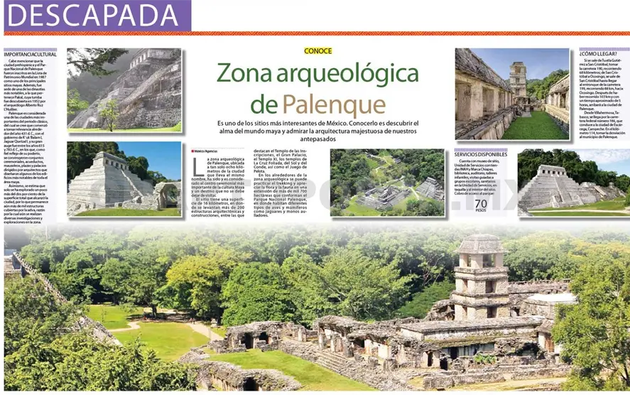 El sitio tiene una superficie de 16 kilómetros, en donde se levantan más de 200 estructuras arquitectónicas y construcciones, entre las que destacan el Templo de las Inscripciones, el Gran Palacio, el Templo XI, los templos de La Cruz Foliada, del Sol y del Conde, así como el Juego de Pelota.