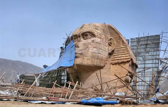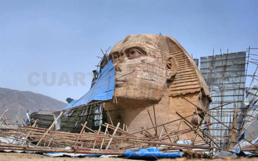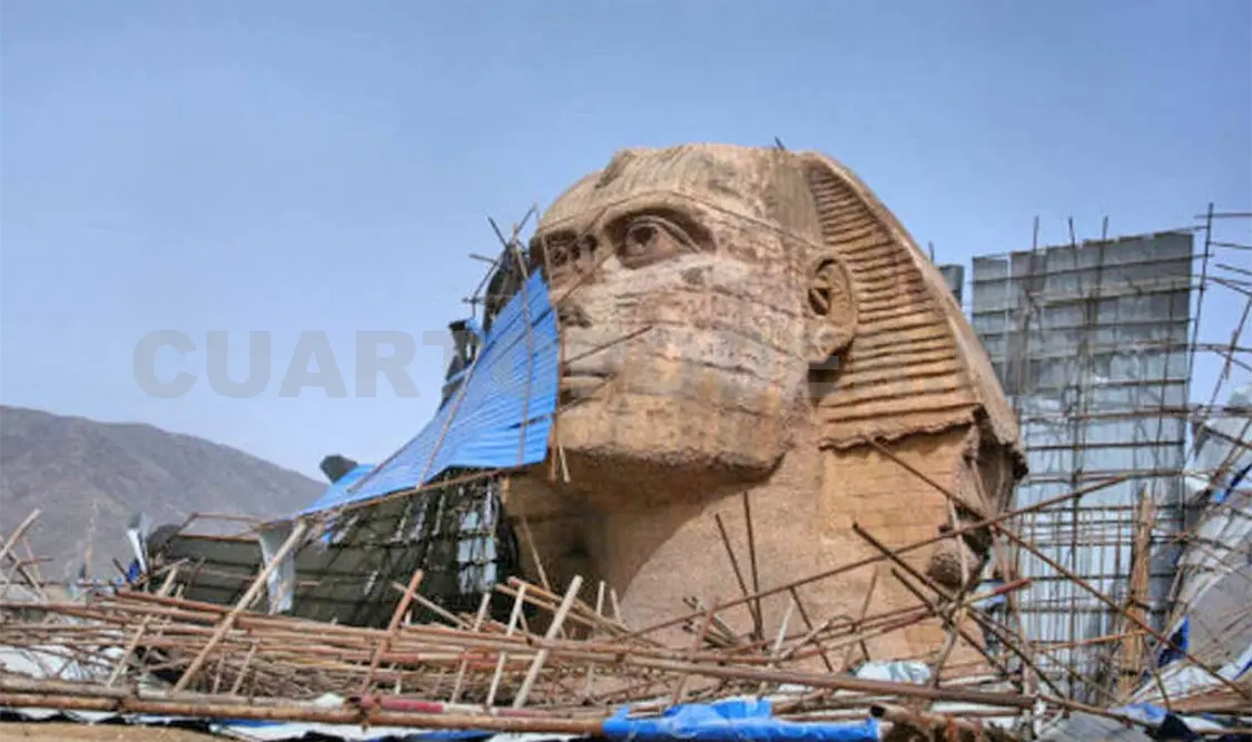 La esfinge, de 60 metros de longitud y 20 de altura, está siendo desmantelada progresivamente, según muestran unas imágenes divulgadas por la web, en las que la copia aparece rodeada de andamios y ya “decapitada”.