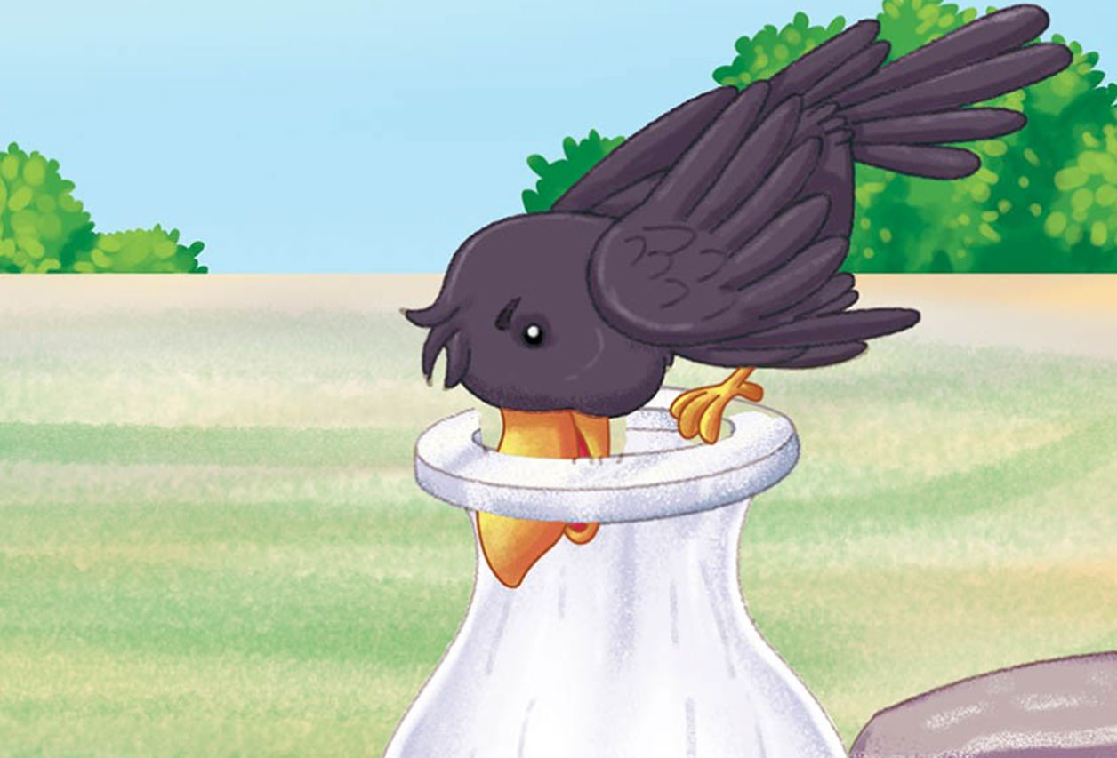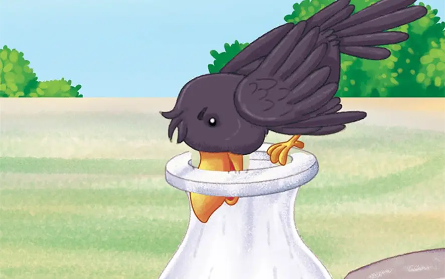 Esta fábula de Esopo describe cómo un cuervo, sediento, intenta beber agua de una jarra pero no puede alcanzarla. Después de varios intentos fallidos, el cuervo tiene la idea de arrojar piedras en la jarra para hacer subir el nivel del agua, lo que finalmente le permite saciar su sed. Moraleja: para resolver problemas necesitas mucha calma e ingenio.