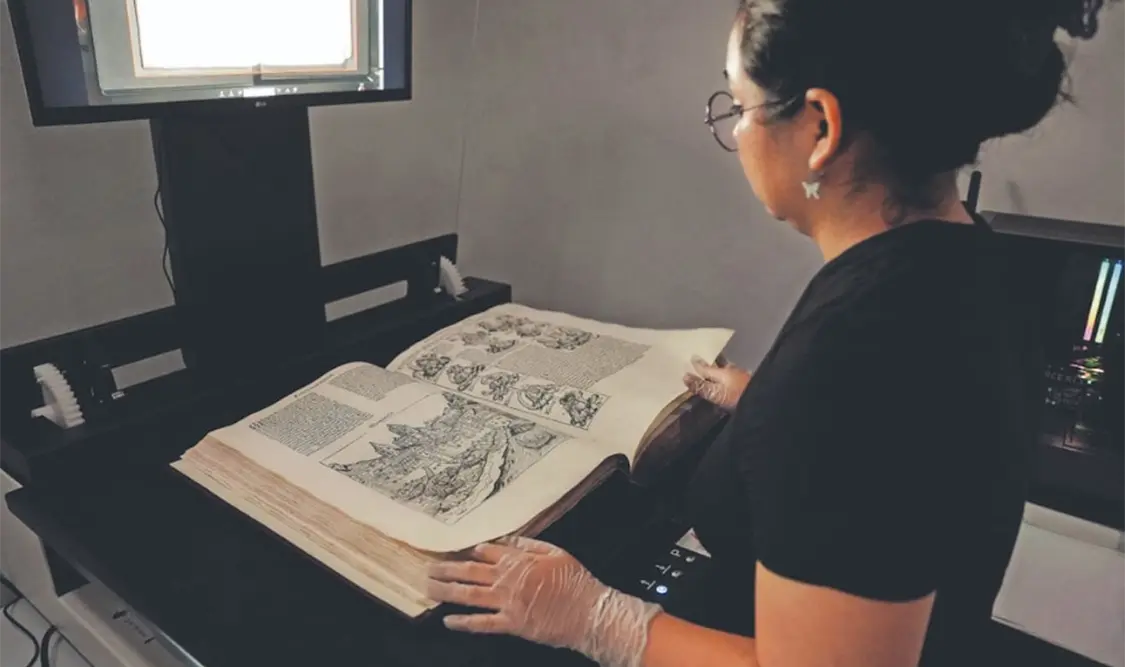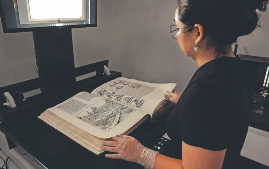 El proceso en gran medida depende del escáner planetario Bookeye 5 V1A, un modelo que no daña un libro, en comparación con los convencionales, porque toma una foto de la obra sin tener que ser tan manipulado o forzar su apertura, además se adapta a las dimensiones y pesos de cada uno de los ejemplares, por muy variados que sean —algunos llegan a pesar más de 10 kilos—, explica la directora.