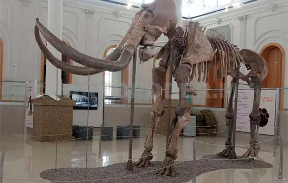 Mamut colombino (Mammuthus columbi), mastodonte americano (Mammut americanum) y los gonfoterios (Stegomastodon y Cuvleronius). El ejemplar en exhibición fue identificado como Mammuthus columbi, de los animales más grandes del planeta, con una altura superior a los cuatro metros y un peso de 10 toneladas.