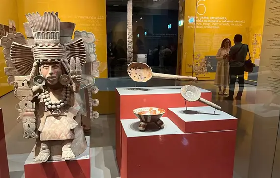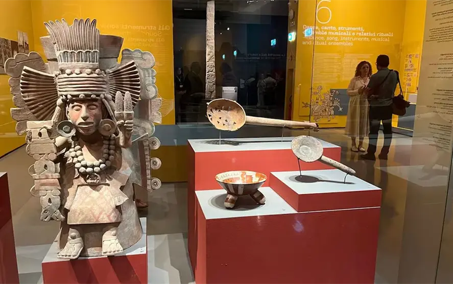 Además de las piezas arqueológicas, se verán fotografías de conjuntos sonoros actuales, producto de investigaciones etnográficas; imágenes de códices anteriores al contacto con los europeos y radiografías e infografías sobre la materialidad y tecnología de algunos instrumentos.