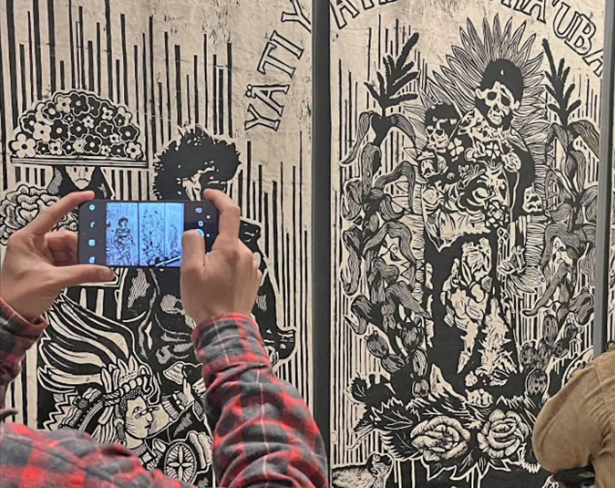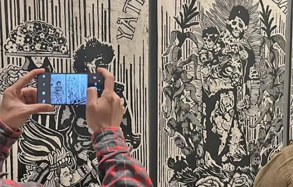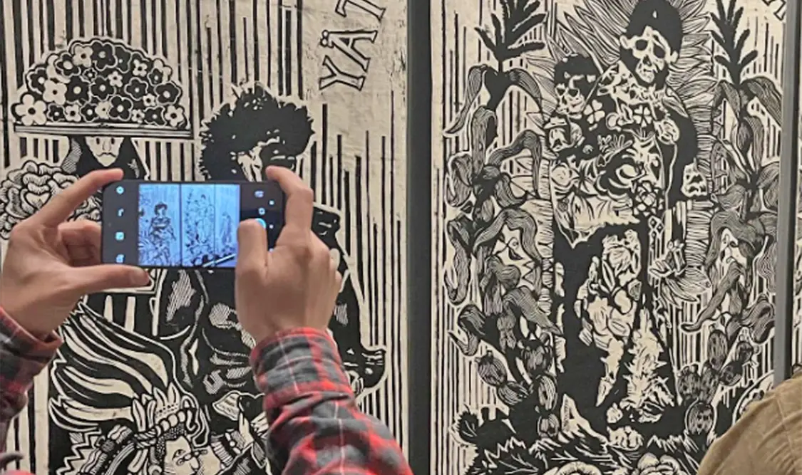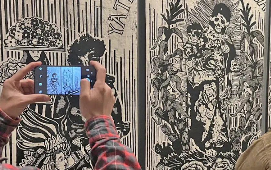 La exposición reúne obras de jóvenes estudiantes que, a través de la gráfica contemporánea, reflexionan sobre la tradición, la memoria y el espíritu festivo del Día de Muertos en México.