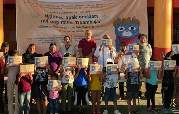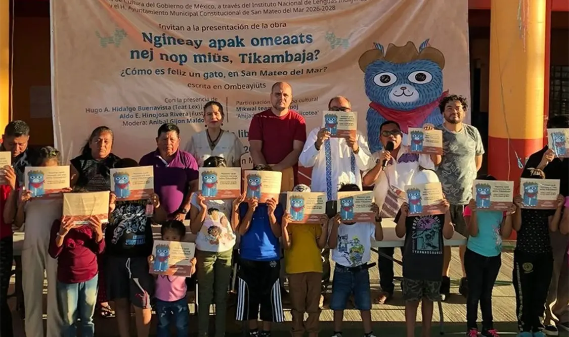 El primer evento se llevó a cabo en la explanada municipal de San Mateo del Mar, donde se entregó el texto bilingüe, escrito en las lenguas ombeayiüts y español, Ngineay apak omeaats nej nop miüs, Tikambaja? ¿Cómo es feliz un gato, en San Mateo del Mar?, resultado del trabajo creativo de Hugo Alberto Hidalgo Buenavista, autor de la obra y hablante de este idioma, junto con el ilustrador Aldo Hinojosa. También participó María Fernanda Ramírez Acevedo, quien colaboró en los gráficos.