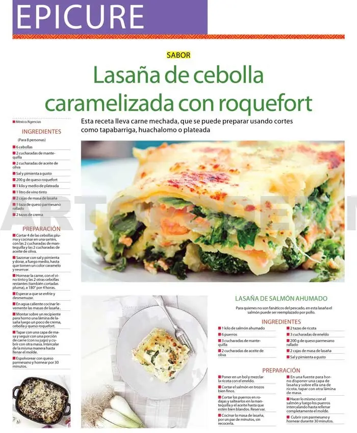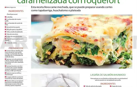 Lasaña de cebolla caramelizada con roquefort.Esta receta lleva carne mechada, que se puede preparar usando cortes como tapabarriga, huachalomo o plateada.