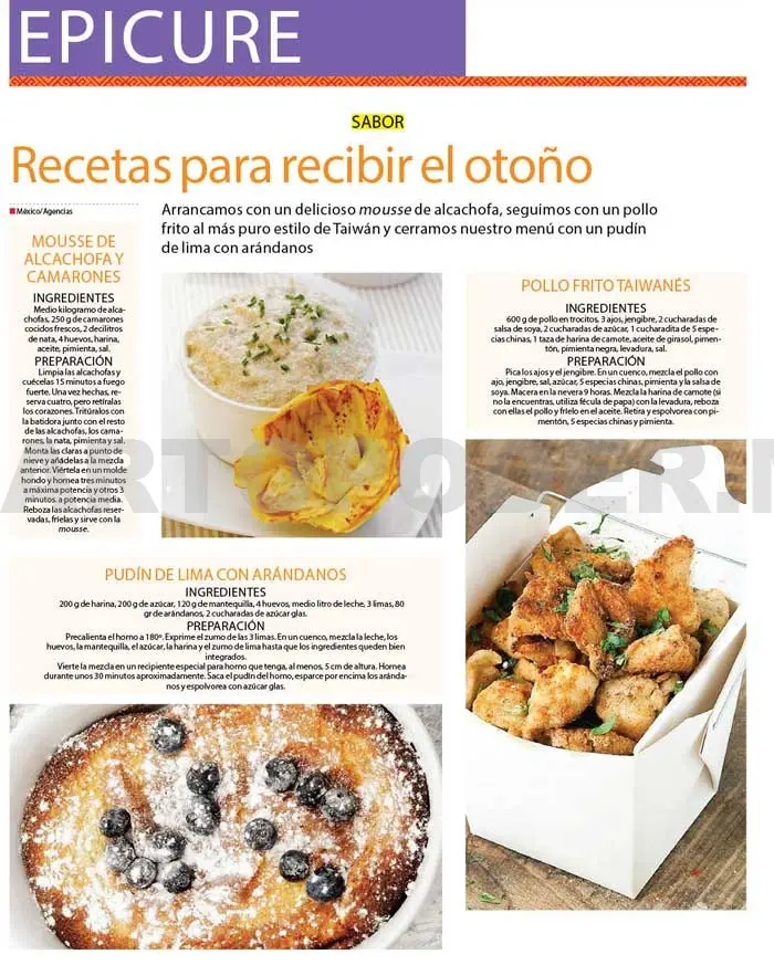 Recetas para recibir el otoño.Arrancamos con un delicioso mousse de alcachofa, seguimos con un pollo frito al más puro estilo de Taiwán y cerramos nuestro menú con un pudín de lima con arándanos.