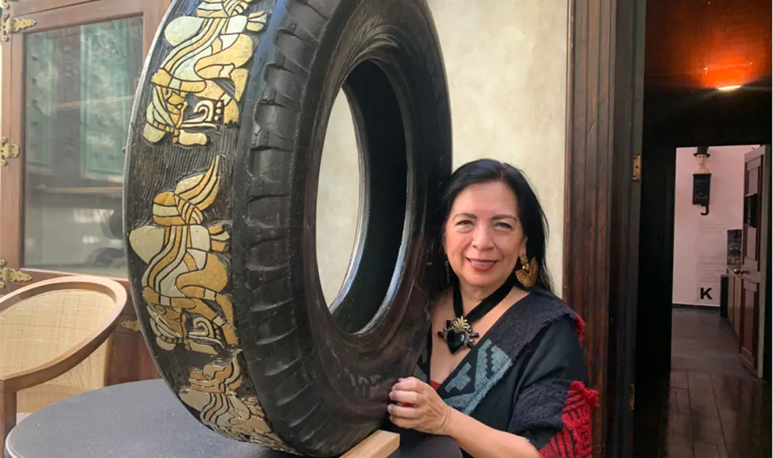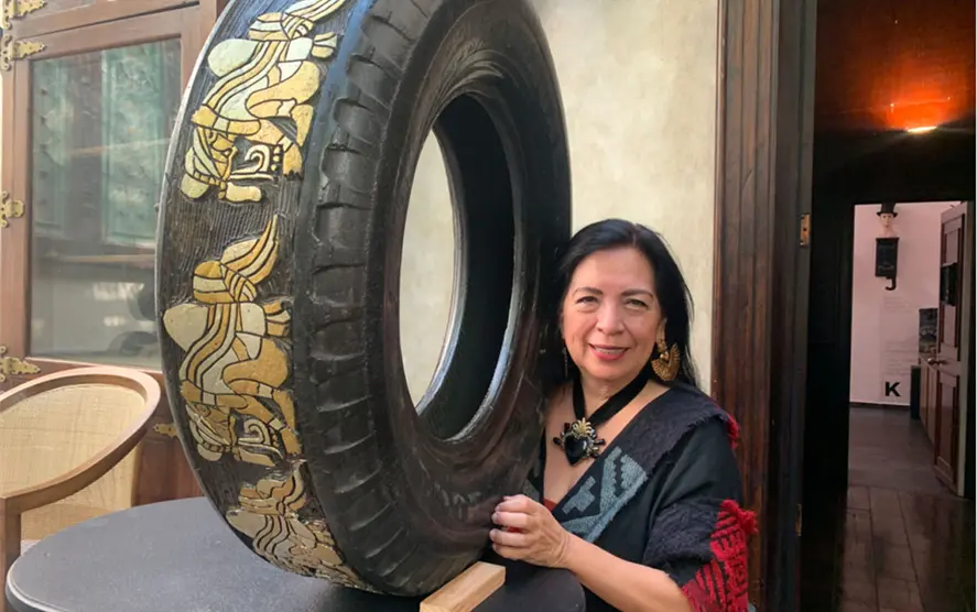 La escultora contemporánea sigue la línea que ha trabajado en los últimos años, al utilizar llantas de tractores y camiones para intervenirlas, para dar su mensaje acerca de problemáticas sociales como la crisis migratoria y el desplazamiento forzado.